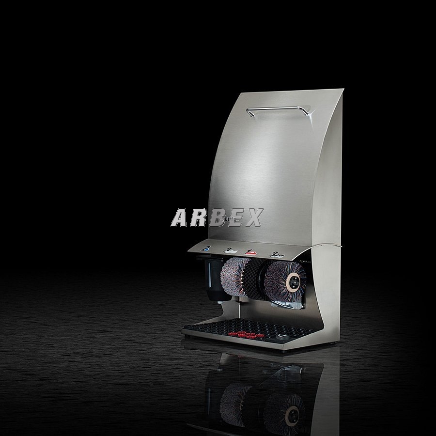 Stříbrný (nerezový) čistič obuvi Elegance Color plus je elegantní čistič, který je určen především do menších hotelů, penzionů, bank a kanceláří. Jedná se o elegantní čistič se třemi kartáči a nádržkou na polituru. Čistič na boty Elegance Color plus je vybaven nožním senzorem s časovačem.