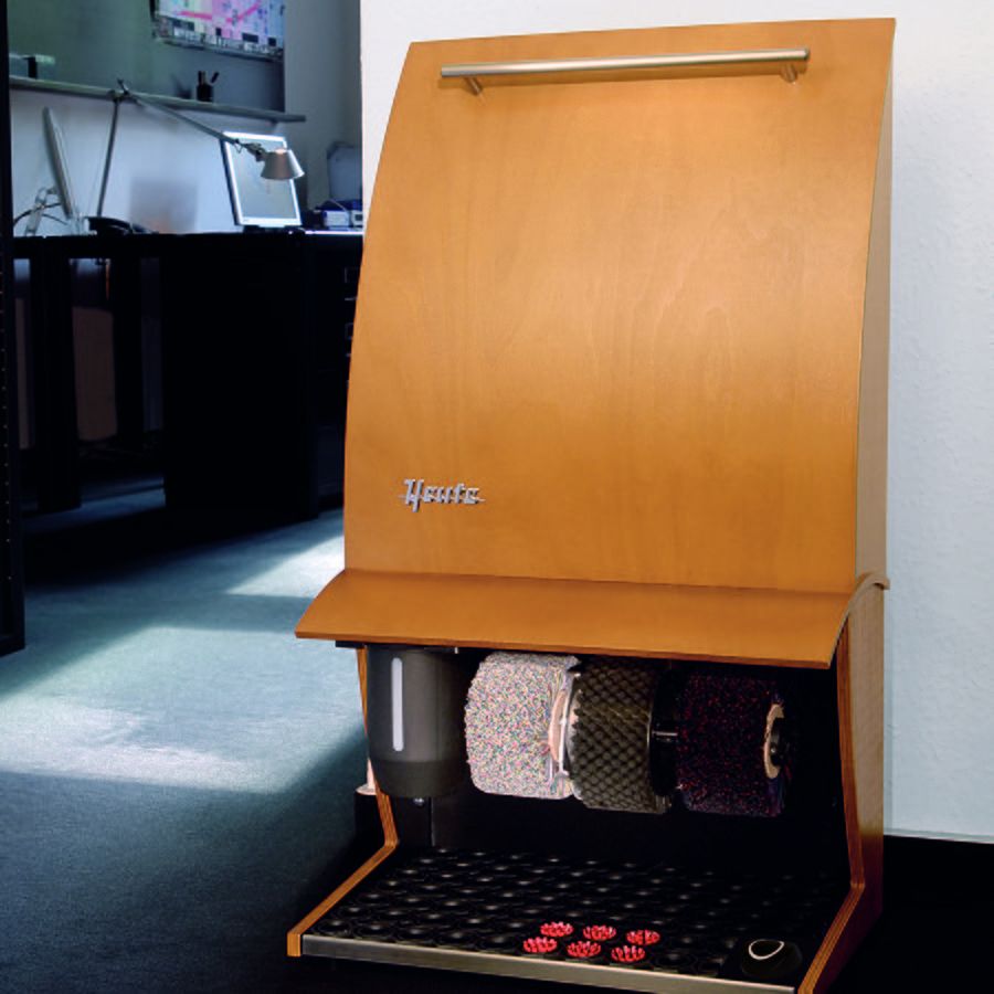 Čistič obuvi Elegance Nature plus má jeden čistící, dva leštící kartáče a nádržku na polituru. Jedná se elegantní čistič bot, jehož kryt je vyroben v několika dřevěných variantách. Okartáčovaná nečistota padá do vyjímatelné gumové rohože, která je osazena kartáčky na čištění podrážek bot.