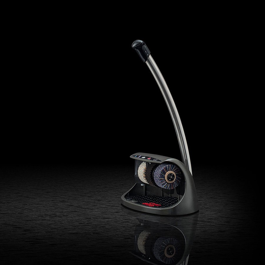 Grafitový čistič obuvi Cosmo plus je elegantní a kompaktní čistič obuvi, který najde uplatnění především v menších hotelích, penzionech a v místech, kde není tak rušný pohyb osob, jako ve velkých komplexech a budovách. Jedná se o kompaktní čistič se třemi kartáči a nádržkou na polituru. Čistič na boty Cosmo plus je vybaven ergonomickou rukojetí v jejímž zakončení je integrován ruční spínač s časovačem.