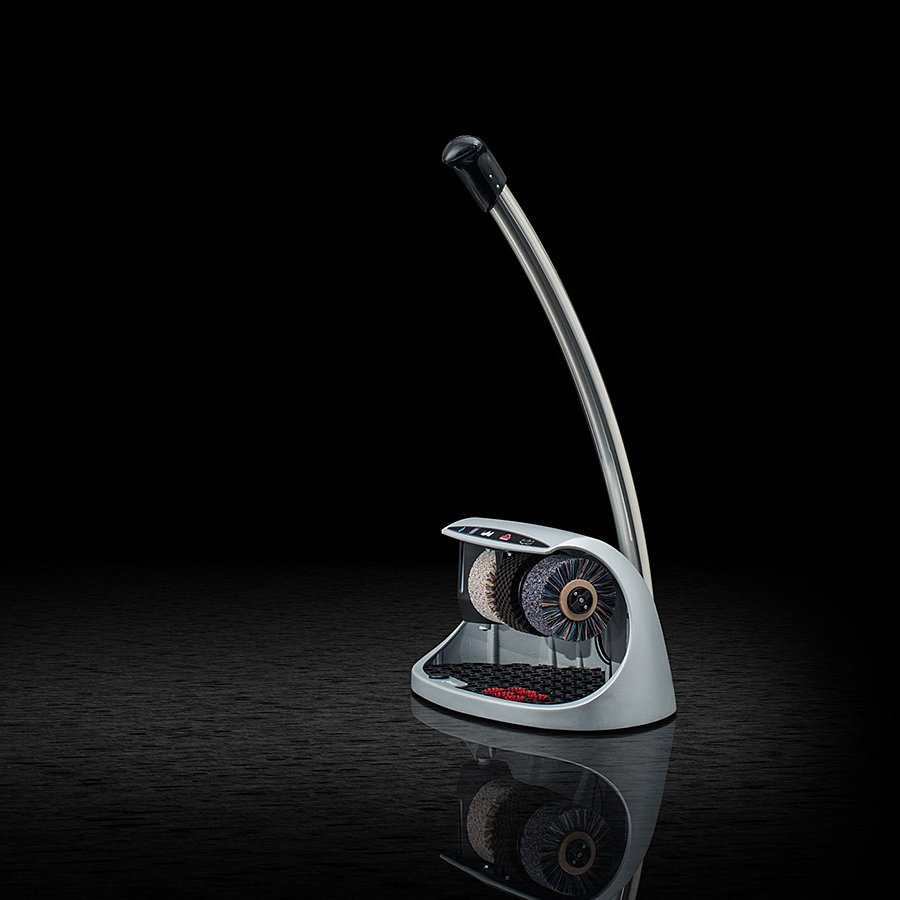 Stříbrný čistič obuvi Cosmo plus je elegantní a kompaktní čistič obuvi, který najde uplatnění především v menších hotelích, penzionech a v místech, kde není tak rušný pohyb osob, jako ve velkých komplexech a budovách. Jedná se o kompaktní čistič se třemi kartáči a nádržkou na polituru. Čistič na boty Cosmo plus je vybaven ergonomickou rukojetí v jejímž zakončení je integrován ruční spínač s časovačem.