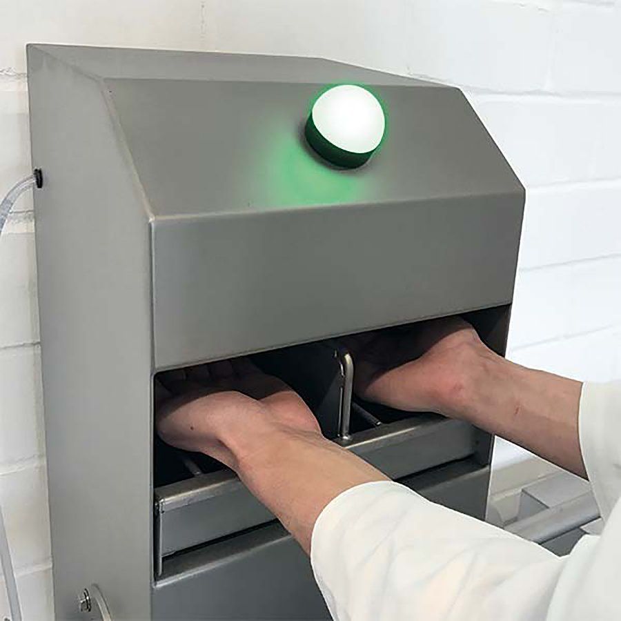 Čistič obuvi a podrážek Neptun HCS1 je určen pro čištění pracovní obuvi v průmyslových a výrobních prostorech, ve kterých je potřeba zabezpečit čistý a hygienicky nezávadný prostor. Tento čistící stroj podrážek obuvi je navíc vybaven integrovaným čističem rukou. Tento dezinfekční čistič rukou je bezkontaktní a je spouštěn dvěmi infračervenými senzory.
