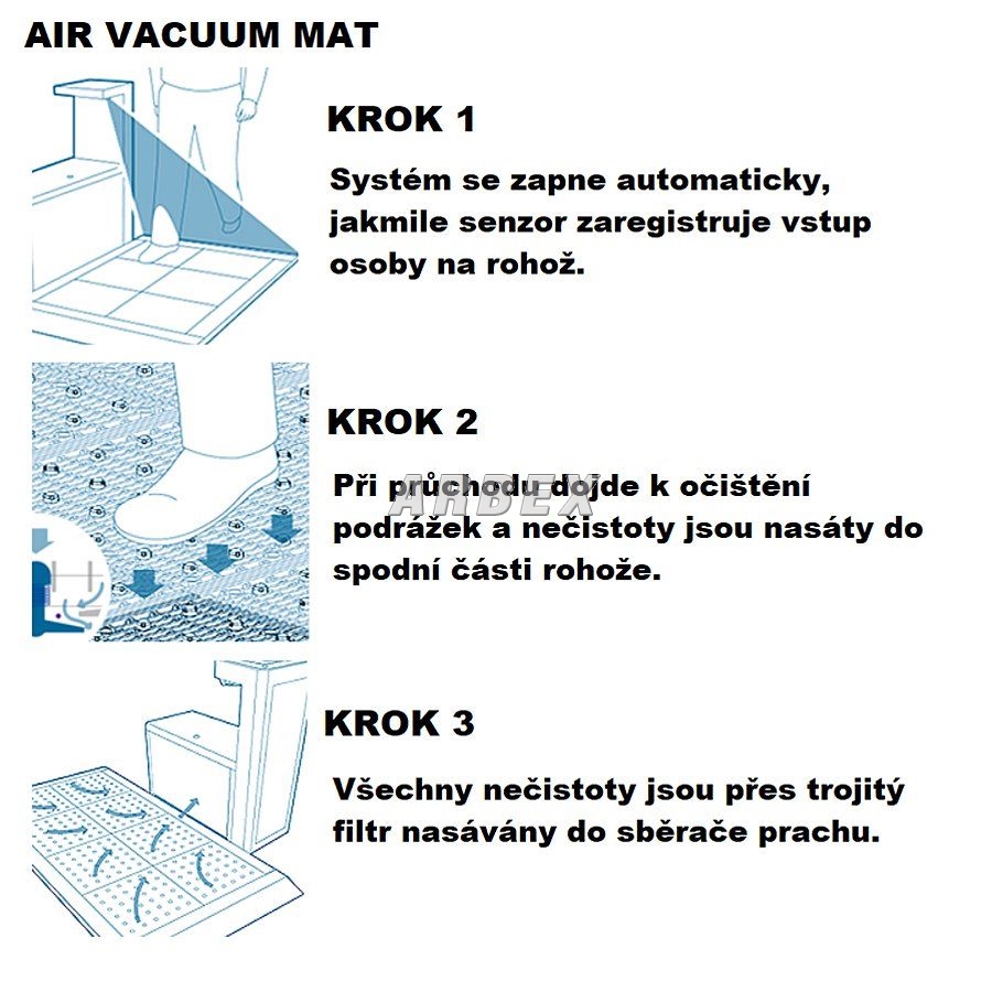 Odsávaní nečistot se porvádí pomocí silného dvojitého vakuového motoru, který odsává veškeré nečistoty, které se uvolní při průchodu rohoží. Spuštění odsávání se provádí automaticky. Při průchodu osoby dojde k zaznemnání pohybu pomocí čidla a celý proces je tak velmi jednoduchý.