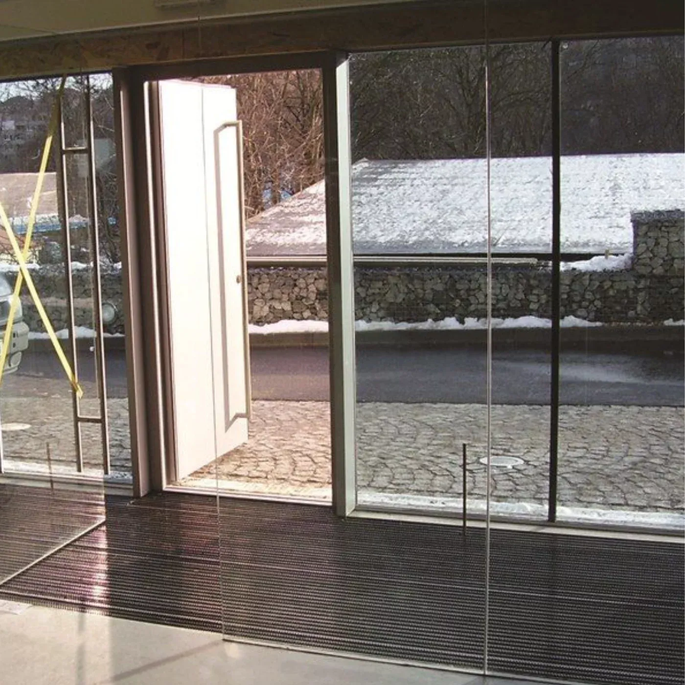 - Rohož je možné v úrovni podlahy uložit do připraveného otvoru osazeného hliníkovým / nerezovým rámem šířky 25, výšky 25 a tloušťky 3 mm.