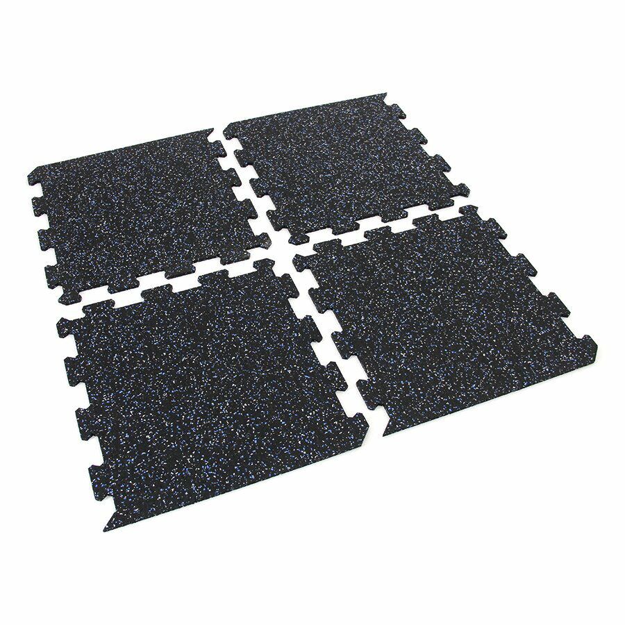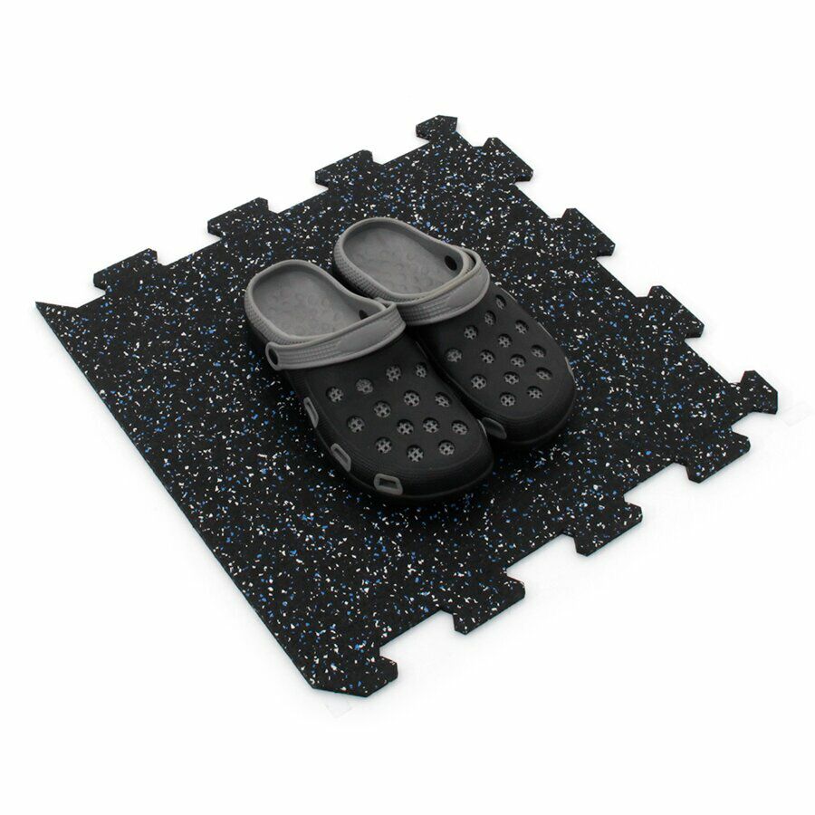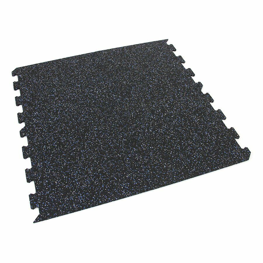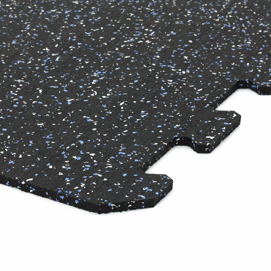 Gumová dlažba (modulová podlaha) FLOMA FitFlo SF1050 s příměsí 5+5% EPDM barevného granulátu v provedení 5% bílá + 5% modrá je ideální podlahou do domácích posiloven a fitness (profesionální fitness centra obvykle volí výšku 1,6 cm). Velice dobře absorbuje nárazy, pády při cvičení, zmírňují dopady činek a cvičícího nářadí. Nespornou výhodou materiálu je také šetrnost ke kloubnímu aparátu cvičence. Tato gumová podlahovina se dá použít jako celoplošná podlaha do domacích fitness, jako pochůzné plochy v posilovnách, jako podložky pod cvičící stroje, odkládací plochy pro činky a další.