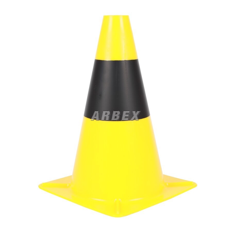 Černo-žlutý výstražný dopravní kužel je vhodný k dočasnému značení nebezpečných úseků a překážek ve výrobních halách a skladech, pro upozornění na překážku či jinak nebezpečný úsek. Vnitřek je dutý a je možno ho naplnit pískem pro větší stabilitu. Podložka ve tvaru čtverce zabraňuje kutálení kužele v případě jeho převrácení.