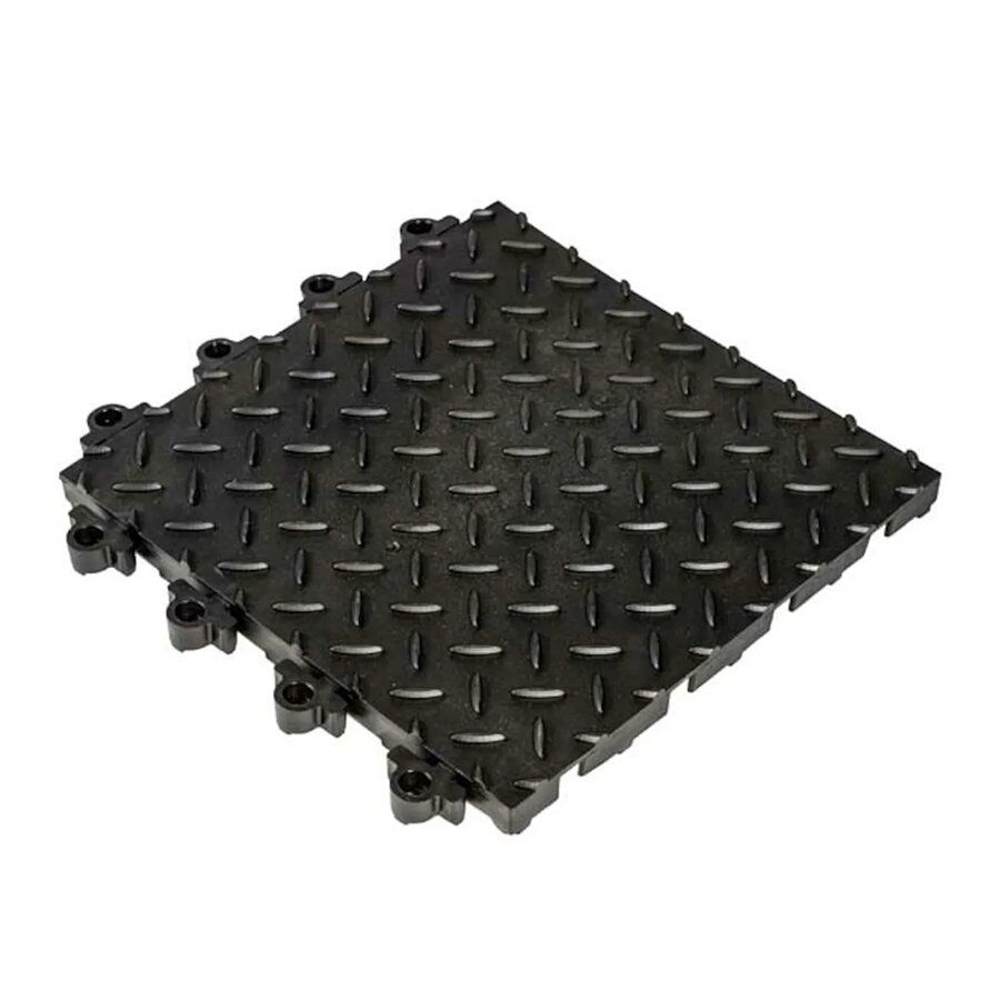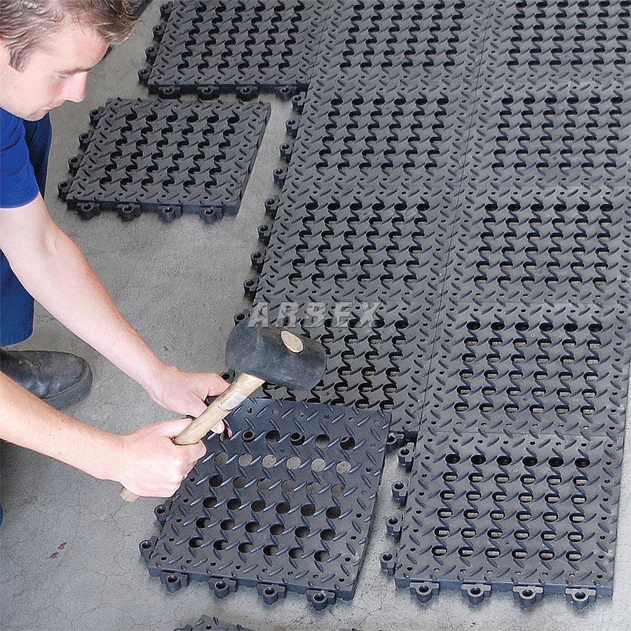 Modulové průmyslové protiúnavové a protiskluzové dlaždice Diamond Flex Lok z tvrdého PVC chrání podlahu a snižují únavu pracovníků. Protiskluzný povrch zvyšuje bezpečnost práce. Volitelné zešikmené hrany umožňují bezpečný přístup na rohož.