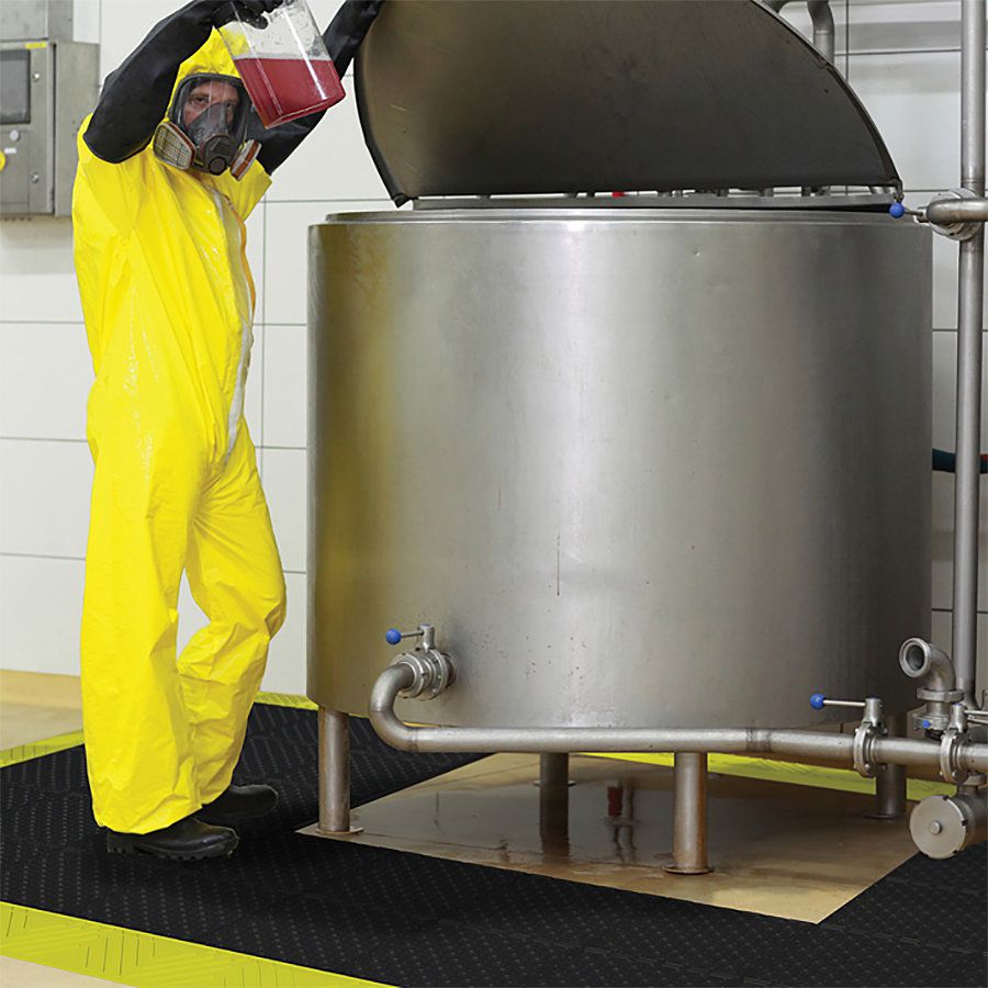 Žlutá náběhová hrana Diamond Flex Lok Safety Ramp pro bezpečnější přístup na rohož. Modulové průmyslové protiúnavové a protiskluzové dlaždice Diamond Flex Lok z tvrdého PVC chrání podlahu a snižují únavu pracovníků. Protiskluzný povrch zvyšuje bezpečnost práce. Volitelné zešikmené hrany umožňují bezpečný přístup na rohož.