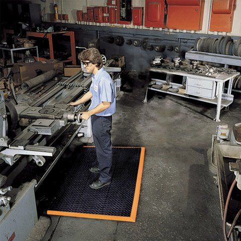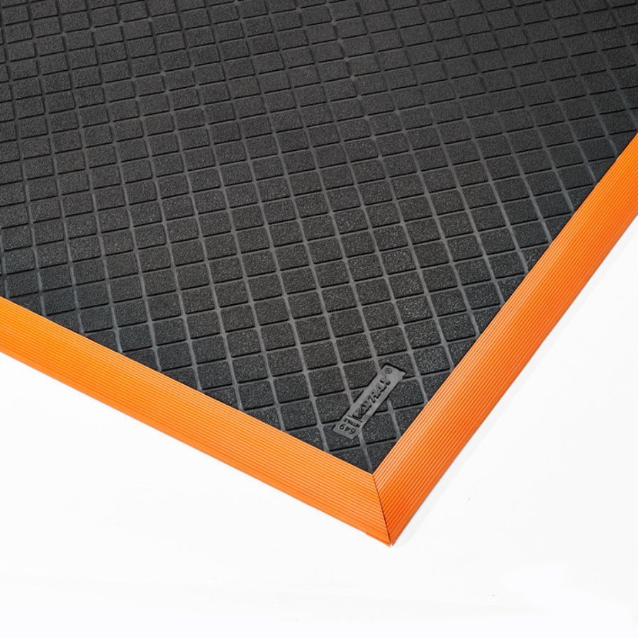 Černo-oranžová extra odolná průmyslová olejivzdorná rohož Safety Stance Solid je vyrobena ze 100% nitrilové směsi odolné průmyslovým olejům a chemikáliím. Vhodná do vícesměnných provozů. Protiúnavové rohože nejvyšší kvality určené do průmyslového prostředí s vysokou zátěží. Povrch Diamond Grid garantuje bezpečnou chůzi, kanálky zachycují úniky oleje.