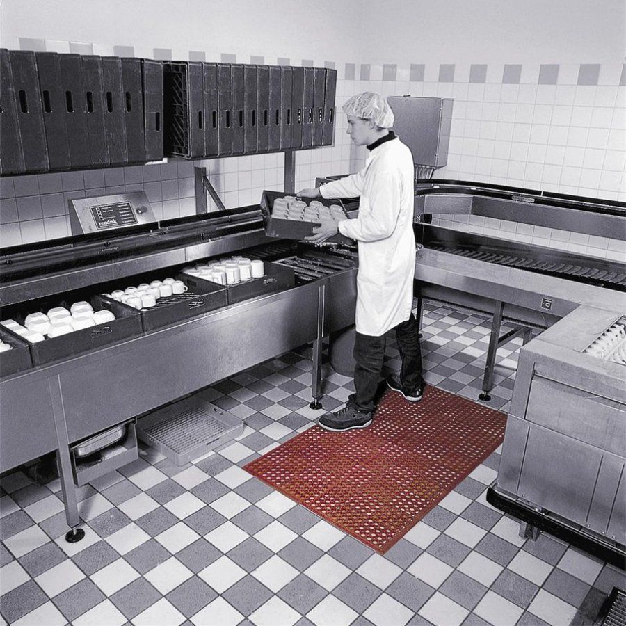 Červená gumová protiskluzová kuchyňská rohož Sanitop Red je rohož do mokrého prostředí. Drenážní otvory umožňují odvětrávání, protékání tekutin a propadávání nečistot, povrch tak zůstává suchý a čistý. Pravidelné čištění saponátem a tlakovou vodou prodlužuje jejich životnost. Neobsahují silikon, jsou vhodné i do lakoven. Rohože nabízejí ergonomický přínos ze stání na 12,7 mm vysoké podložce.