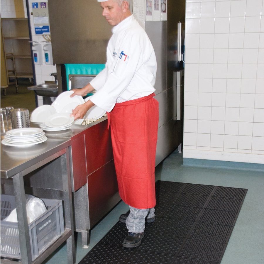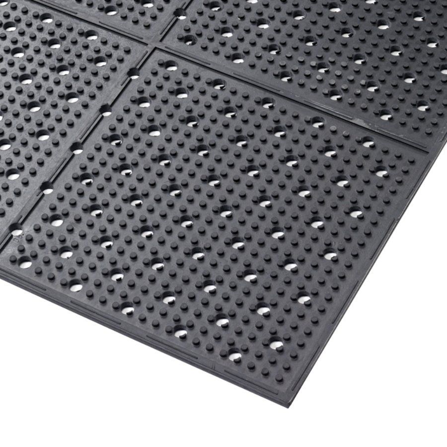 Černá gumová protiskluzová rohož Multi Mat II je oboustranná rohož s drenážními otvory, s výstupky pro zvýšení adheze a odvětrávání, zvyšující bezpečnost pohybu v kluzkém prostředí. Neklouzavé provedení zabraňuje posouvání rohože.