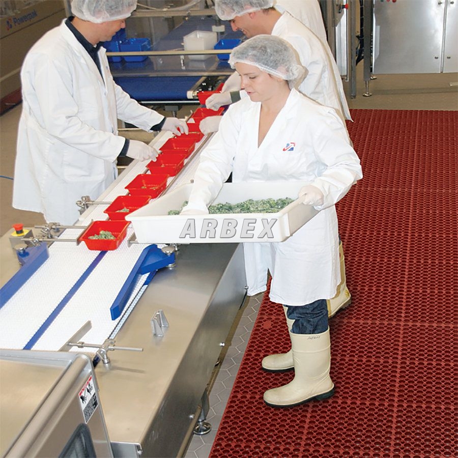 Červená gumová protiúnavová protiskluzová průmyslová rohož Sanitop Deluxe Red je rohož do mokrého prostředí. Drenážní otvory umožňují odvětrávání, protékání tekutin a propadávání nečistot, povrch tak zůstává suchý a čistý. Pravidelné čištění saponátem a tlakovou vodou prodlužuje jejich životnost. Neobsahují silikon, jsou vhodné i do lakoven. Rohož je určená pro mokré nebo mastné prostředí, pro provozy kde dochází ke zpracování potravin, profesionální kuchyně, bary a další.