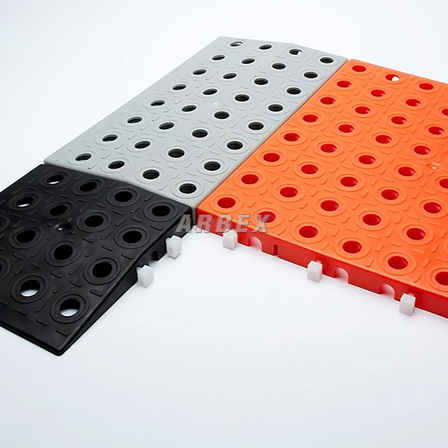 Základním prvkem systému je deska 250x250 mm a pro vytvoření nájezdových hran se využívají rovné a rohové nájezdy. Jednotlivé díly systému se spojují plastovými spojkami, které jsou v příslušném počtu u každého modulu zahrnuty v ceně. Provedení povrchu všech dílů je protiskluzové s otvory o průměru 12 mm, výška desek je 16 mm.