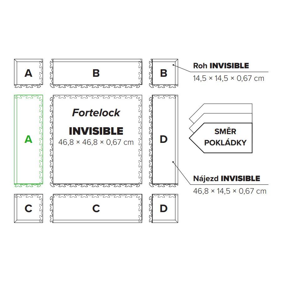 PVC podlahy Fortelock Invisible se vyznačují především těmito vlastnostmi - vysoká odolnost materiálu vůči zátěži, protiskluzný povrch, perfektní zámkový systém, který pevně drží dlaždice při sobě, chemická odolnost, speciálně navržen dezén, který usnadňuje čištění a v neposlední řade systém odvodných kanálků Air Flow, který brání zadržování vody pod podlahou a umožňuje ji větrat. To je jen pár výhod, na které se můžete spolehnout po instalaci PVC dlažby Fortelock Invisible.