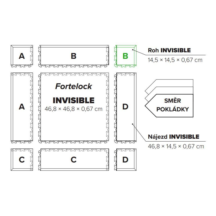 PVC podlahy Fortelock Invisible se vyznačují především těmito vlastnostmi - vysoká odolnost materiálu vůči zátěži, protiskluzný povrch, perfektní zámkový systém, který pevně drží dlaždice při sobě, chemická odolnost, speciálně navržen dezén, který usnadňuje čištění a v neposlední řade systém odvodných kanálků Air Flow, který brání zadržování vody pod podlahou a umožňuje ji větrat. To je jen pár výhod, na které se můžete spolehnout po instalaci PVC dlažby Fortelock Invisible.