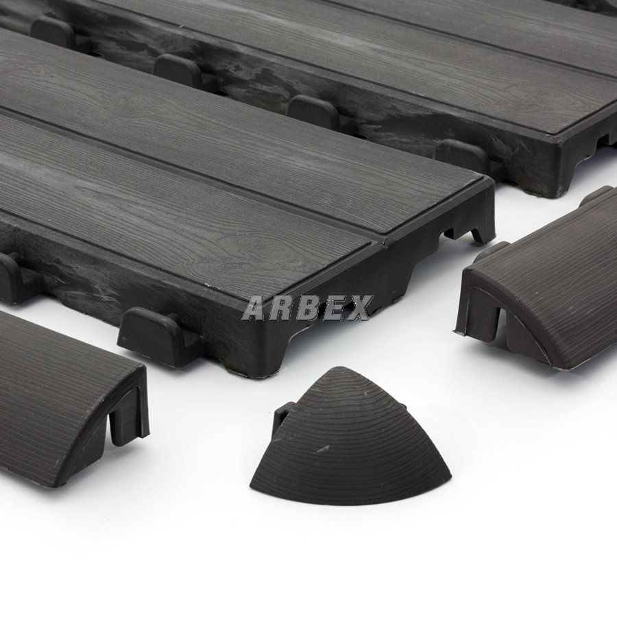 Rohový nájezd pro dlaždice Woodenlike vyroben z polypropylenu s dezénem imitujícím dřevo je vhodný pro venkovní použití, například na zahradách, v altánech, v kempech atp. Rohový nájezd pro dlaždice je samo-upínací a nepotřebuje tak žádný základ, upevňovací systém ani nářadí.
