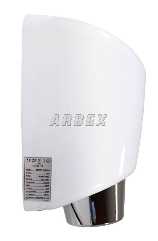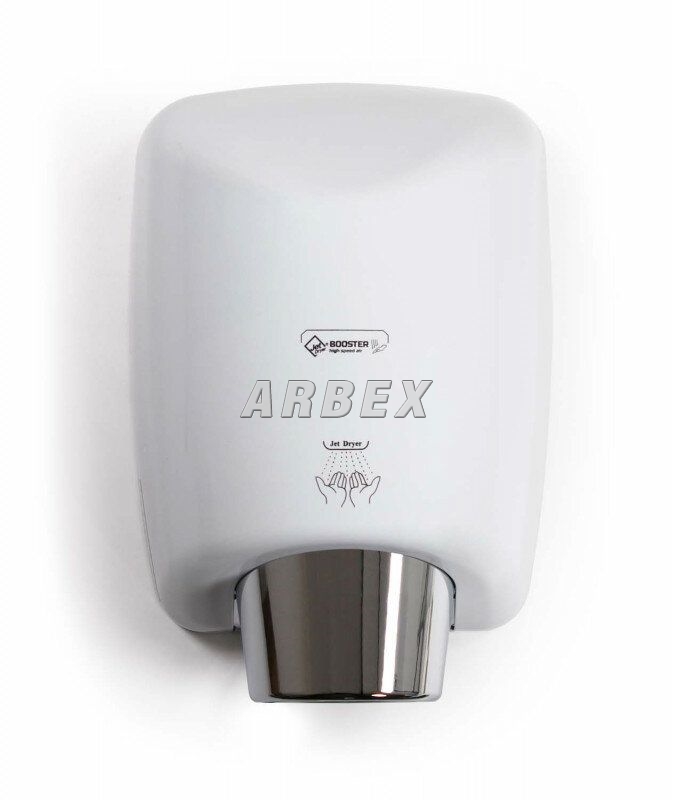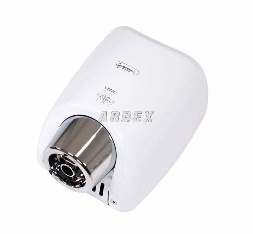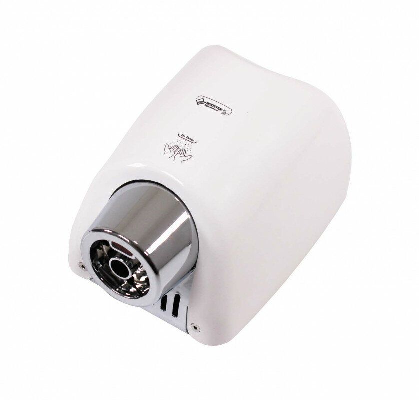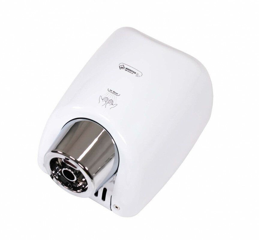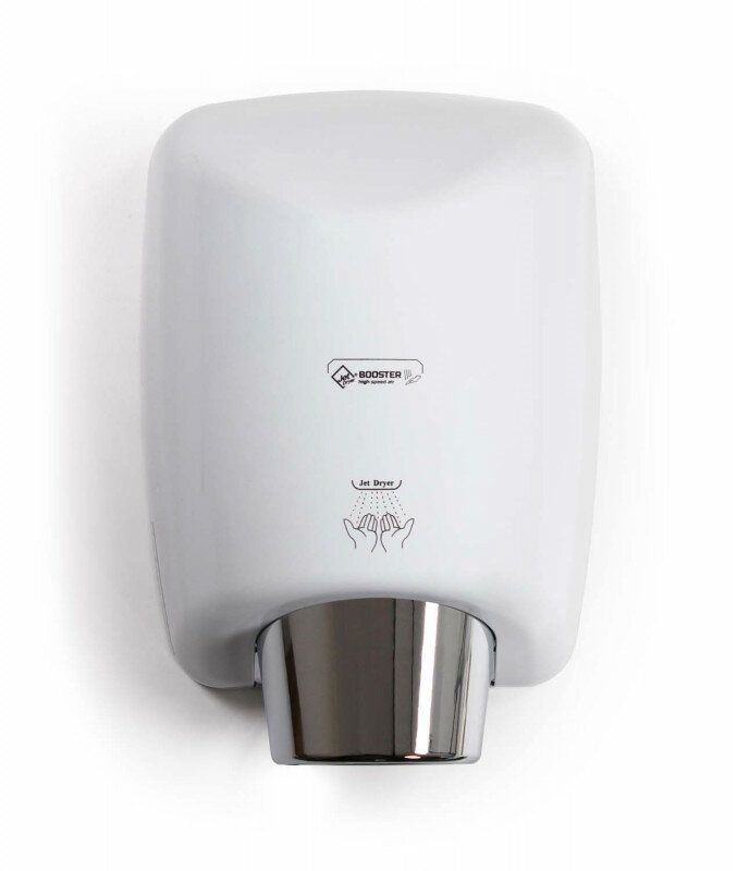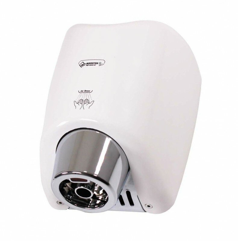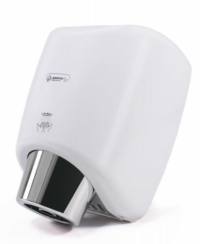 Osoušeč rukou BOOSTER se od jiných osoušečů vyznačuje výraznou pochromovanou tryskou kruhového tvaru. Díky silnému 550 W motoru je vysušení rukou velmi rychlé.