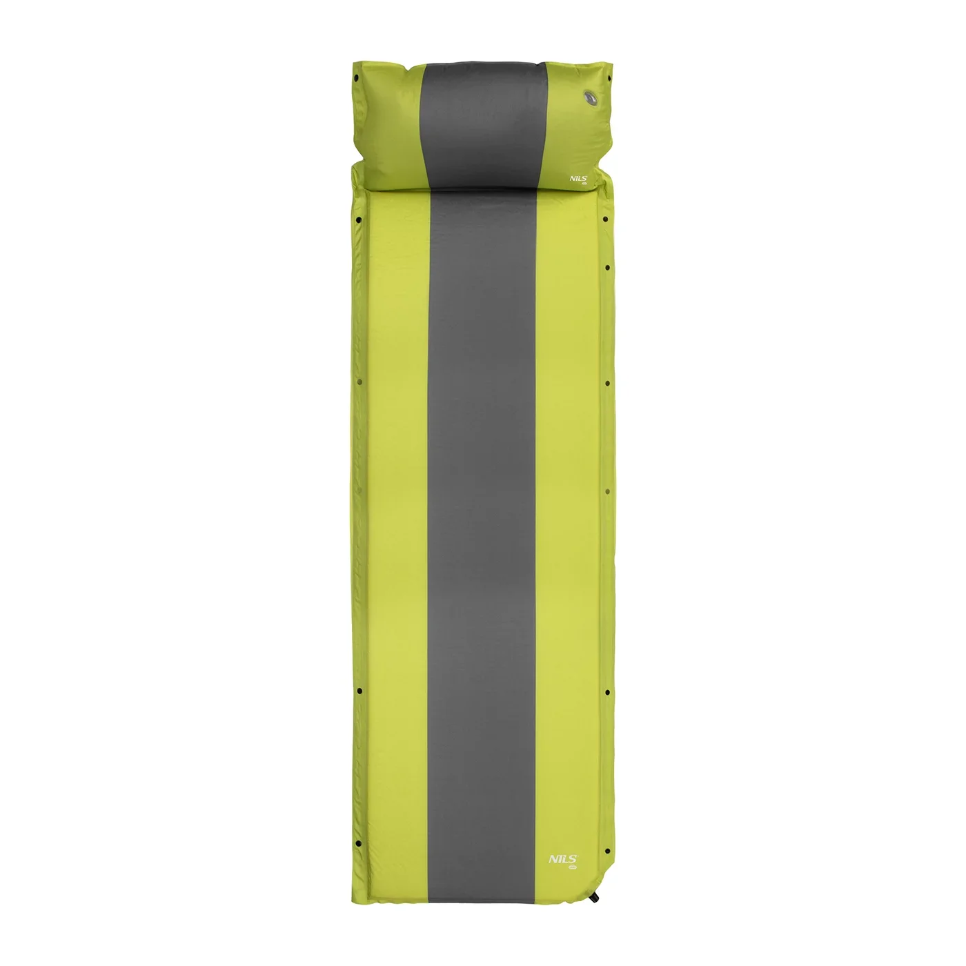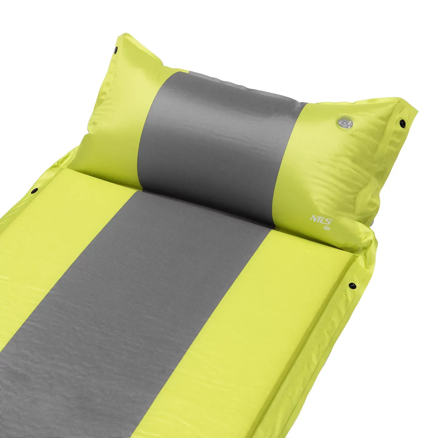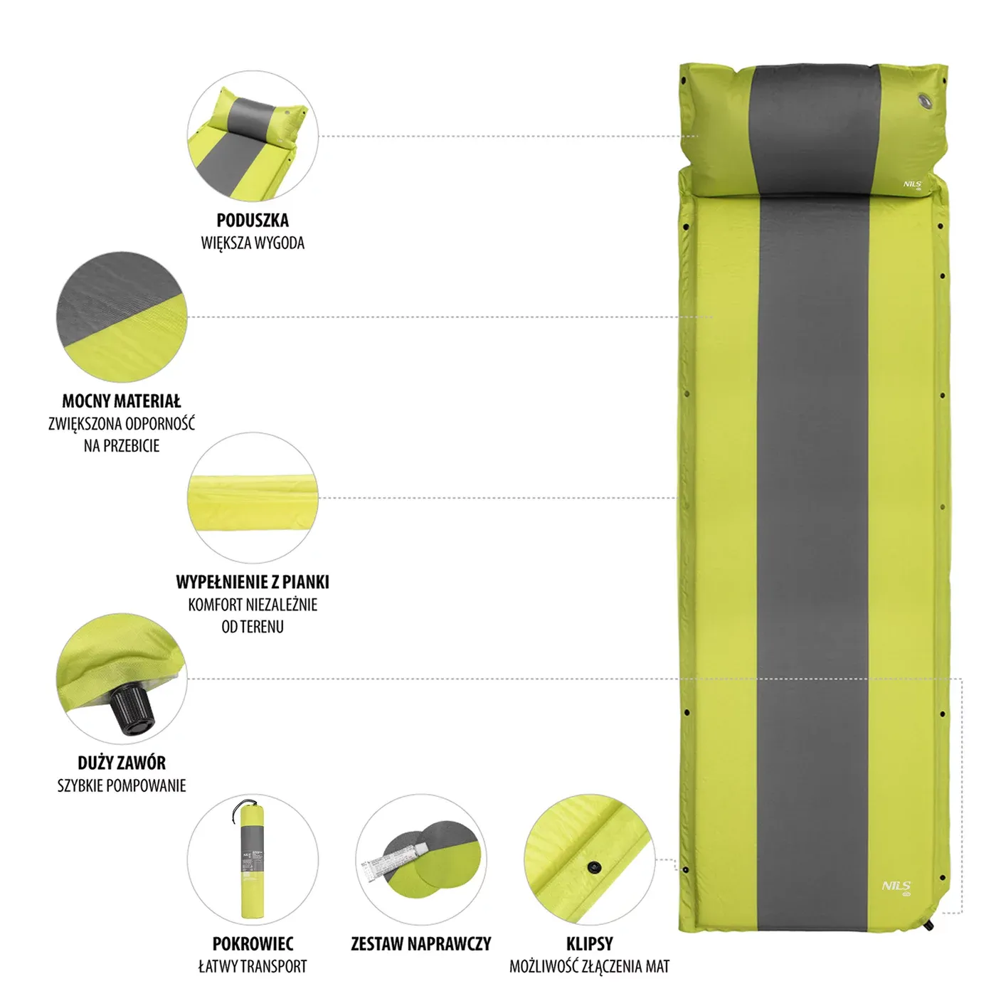 Šedo-zelená samonafukovací karimatka s podhlavníkem zajistí kvalitní spánek během kempování a dovolených pod stanem. Podložka je ale vhodná i k vodě a všude tam, kde si chcete příjemně poležet. Samonafouknutí zajišťuje vnitřní, pěnový materiál s otevřenými póry. Po povolení ventilu do sebe nasává vzduch a dostává se tak do původního stavu. Závěrem je ještě potřeba podložku dofouknout na požadovanou tvrdost. Skládání se provádí otevřením ventilu a srolováním od opačné strany, než je ventil. Karimatku poté zajistíme řemínky s přezkami a vložíme do dodávaného vaku. Na model NC4349 byl použit velice odolný polyester 75D potažený vrstvou PVC, tato kombinace zajišťuje vysokou odolnost a karimatka se dá položit i na nerovný povrch. Lemy karimatky jsou opatřeny druky, které umožňují spojit více matrací do jedné, veliké plochy, toto se hodí například k vyplnění podlahy ve stanu. Polštářek není odnímatelný a oproti karimatce není vyplněn pěnou a je potřeba ho celý nafouknout. Součástí balení je také opravná sada, která se hodí v případě poškození.