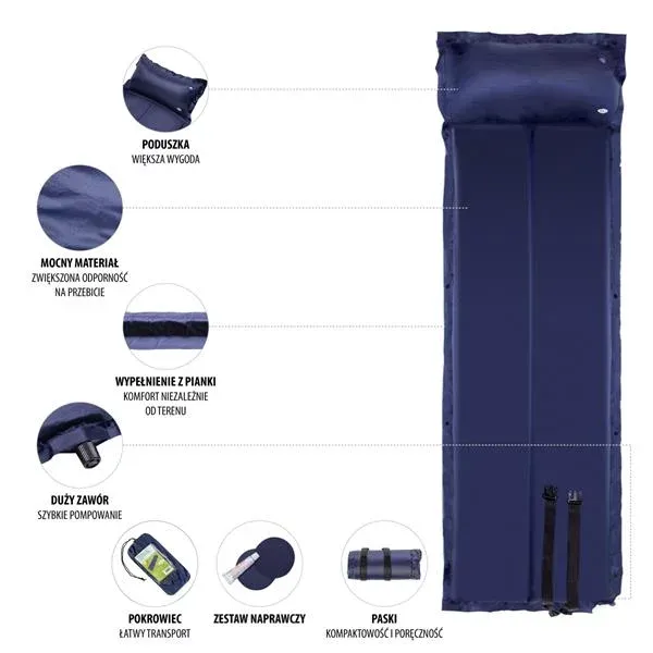 Povrch karimatky tvoří odolný polyester 190T s PVC zátěrem, což zajišťuje vysokou odolnost vůči mechanickému poškození, vlhkosti a nečistotám. Podložku lze bez obav položit i na méně rovný terén, například na lesní půdu nebo štěrk. Karimatka je navíc vybavena integrovaným podhlavníkem, který zvyšuje komfort ležení. Polštářek je třeba celý nafouknout – na rozdíl od samotné karimatky není vyplněn pěnou.