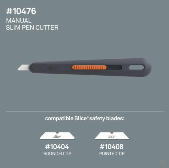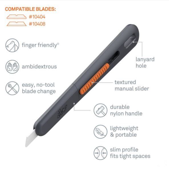 Polohovatelný nůž na krabice Slice 10476 používá stejnou čepel přátelskou k prstům a stejné bezpečnostní výhody jako ostatní nože na krabice. Vlastní patentovanou jedinečnou hranu, která je bezpečná na dotek a vydrží až 11,2krát déle než srovnatelné kovové čepele. Štíhlá rukojeť umožňuje manévrování ve stísněných prostorech a je vybavena bočním posuvníkem pro snadnější manipulaci s palcem.Tento nůž používat oboustranně: stačí otočit hranu čepele v rukojeti pro leváky.