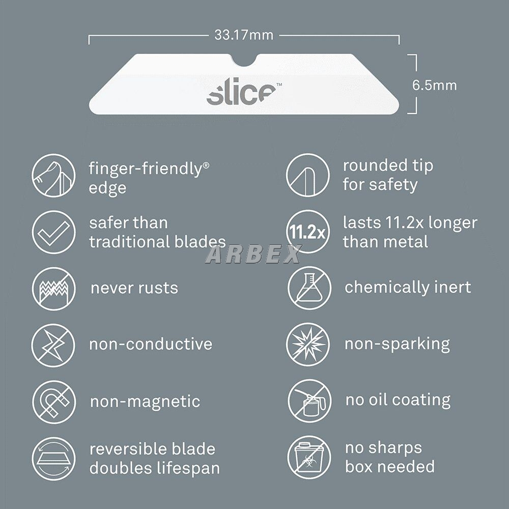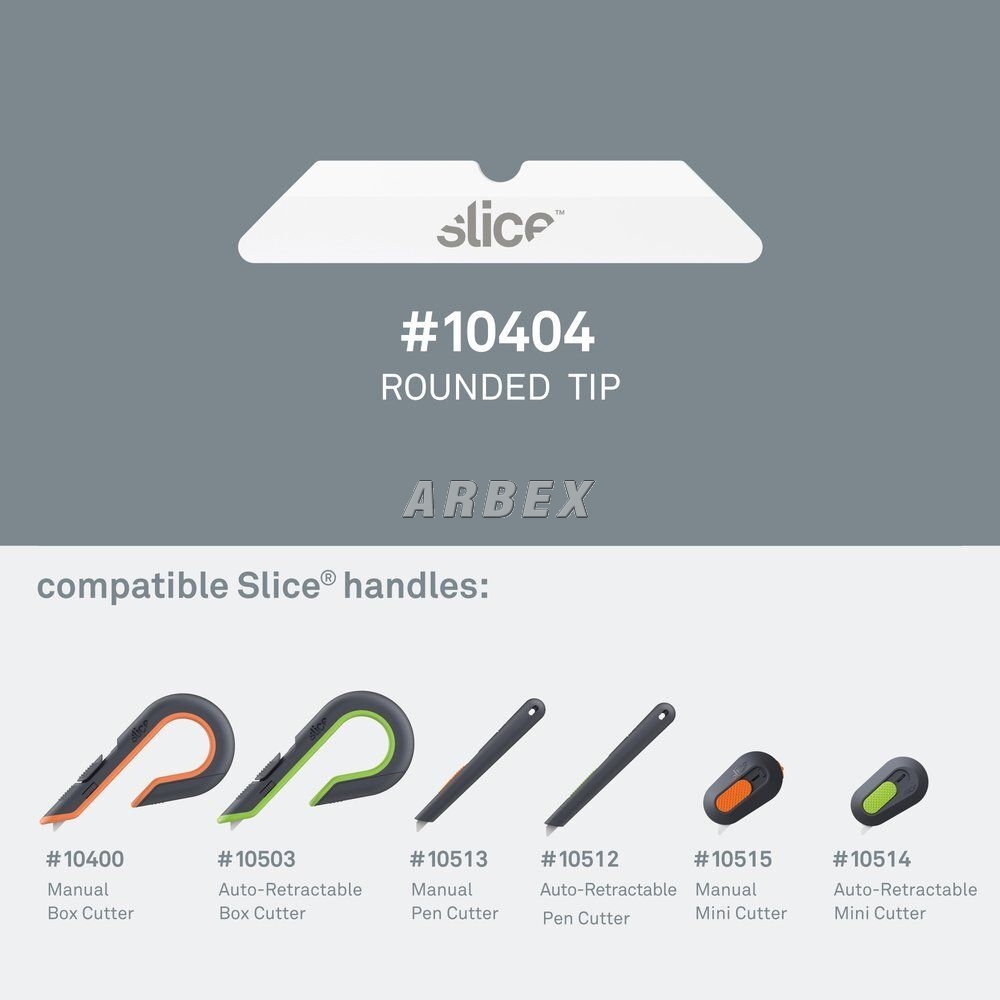 Tyto čepele jsou kompatibilní s noži: Slice 10400, Slice 10503, Slice 10514, Slice 10515, Slice 10512, Slice 10513. Zaoblená špička poskytuje zvýšenou ochranu před zraněním. Až budete potřebovat novou hranu, jednoduše oboustrannou čepel otočte.