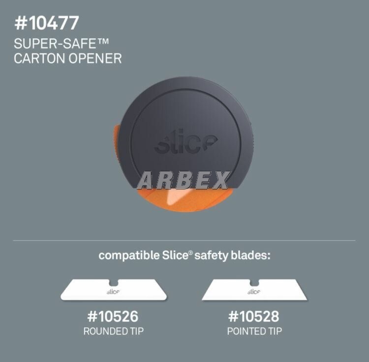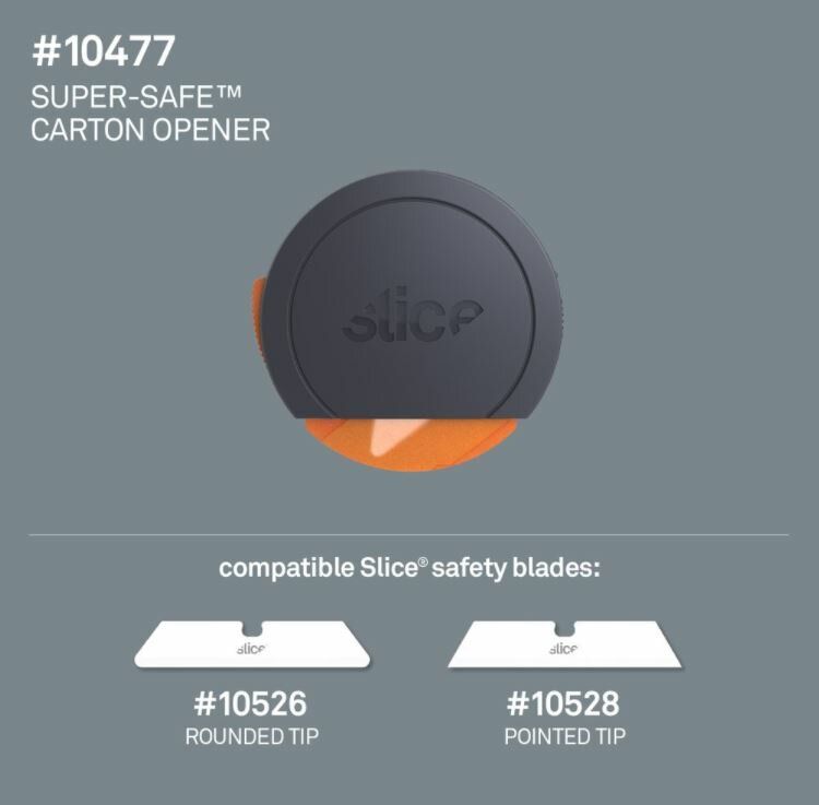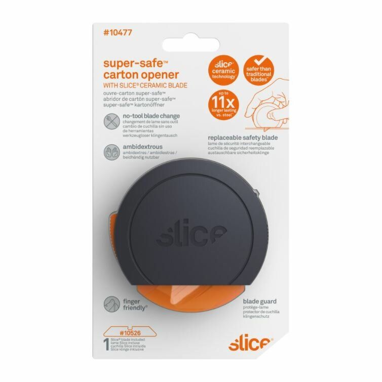 Nůž na krabice Slice 10477 je jedinečný nůž, jehož design ocení zejména lidé se sníženou zručností nebo ti, kteří nosí pracovní rukavice. Jeho velká a kulatá rukojeť se pohodlně vejde do dlaně a snadno s ním docílíte rovných řezů. K uvolnění bezpečnostního krytu čepele stačí ukazovákem stisknout oranžové tlačítko. Poté nástroj rovně přitiskněte k povrchu, který chcete řezat, a táhněte směrem k sobě. Jakmile nůž ztratí kontakt s řezaným materiálem, bezpečnostní kryt čepele se vrátí do původní pozice a ochrání vás před případnými zraněními.