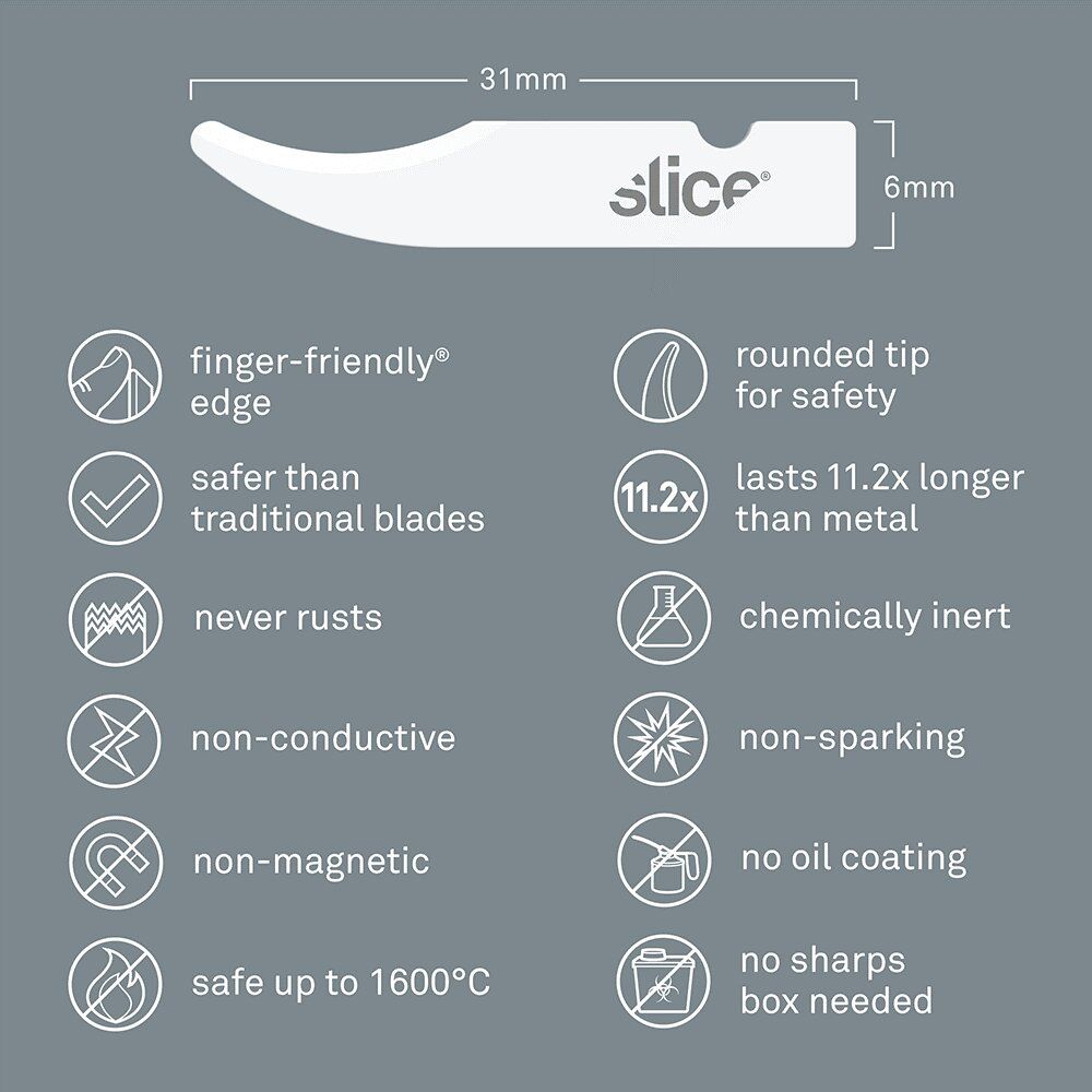 Náhradní čepele SKU 10536 jsou vyrobeny ze 100% oxidu zirkoničitého, což je moderní keramický materiál, který kombinuje řadu užitečných funkcí, které ho odlišují od typických ocelových čepelí. Oxid zirkoničitý je nejiskřivý, nevodivý, nemagnetický, chemicky inertní, nekoroduje a nepotřebuje mazat olejem. Zaoblená špička poskytuje zvýšenou ochranu před zraněním. Až budete potřebovat novou hranu, jednoduše oboustrannou čepel otočte.