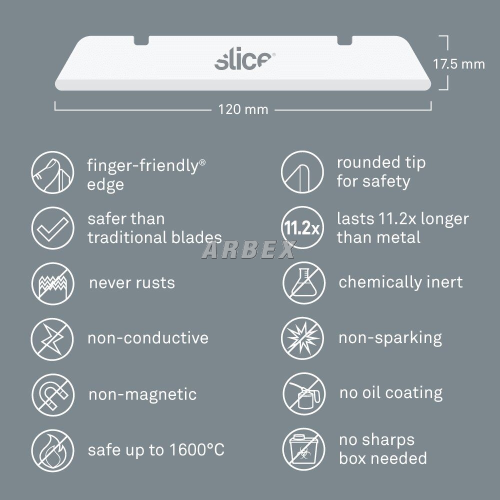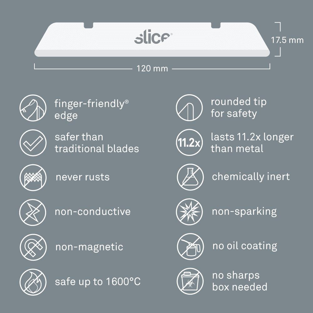Náhradní čepele SKU 10538 jsou vyrobeny ze 100% oxidu zirkoničitého, což je moderní keramický materiál, který kombinuje řadu užitečných funkcí, které ho odlišují od typických ocelových čepelí. Oxid zirkoničitý je nejiskřivý, nevodivý, nemagnetický, chemicky inertní, nekoroduje a nepotřebuje mazat olejem. Zaoblená špička poskytuje zvýšenou ochranu před zraněním.