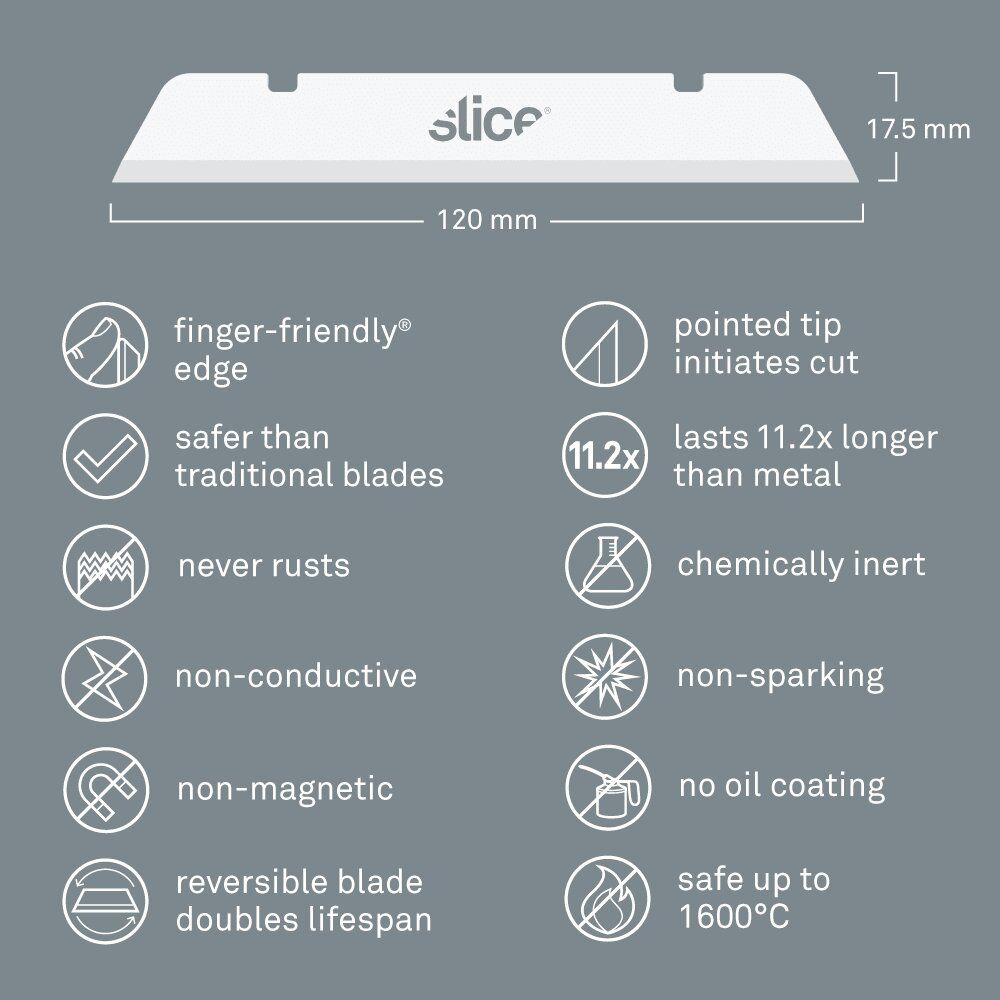 Náhradní čepele SKU 10539 jsou vyrobeny ze 100% oxidu zirkoničitého, což je moderní keramický materiál, který kombinuje řadu užitečných funkcí, které ho odlišují od typických ocelových čepelí. Oxid zirkoničitý je nejiskřivý, nevodivý, nemagnetický, chemicky inertní, nekoroduje a nepotřebuje mazat olejem.