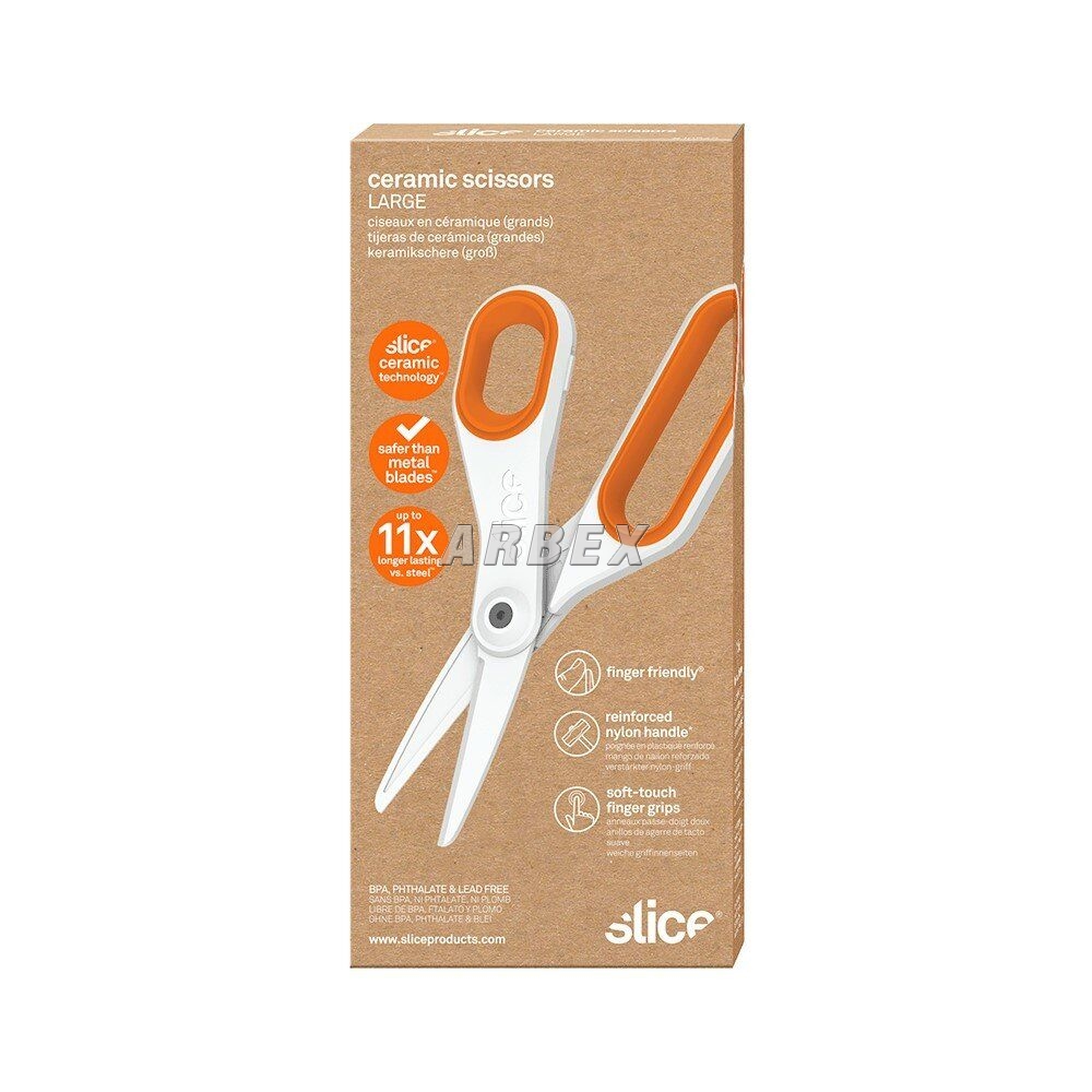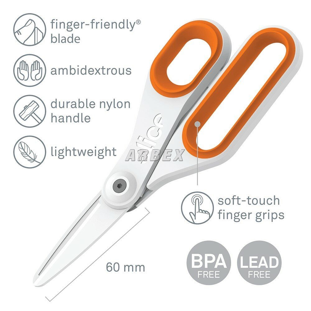 Tyto keramické nůžky přinášejí patentovaný nástroj pro bezpečnější každodenní stříhání. Díky svým vlastnostem jsou odolné, trvanlivé a hojně používané v průmyslovém, institucionálním a vzdělávacím prostředí. Měkké oka pro prsty lemují nylonové rukojeti, které jsou ideální pro kombinaci síly a pohodlí.