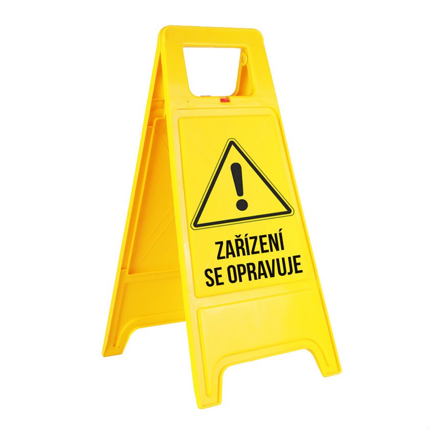 Žlutý plastový výstražný stojan „Pozor! Zařízení se opravuje“ slouží k jasnému a okamžitému označení míst, kde právě probíhá oprava, servis nebo údržba zařízení. Výrazné barevné provedení v kombinaci s výstražným textem a piktogramem zajišťuje vysokou viditelnost a upozorňuje osoby na možné nebezpečí v daném prostoru. Ideální je použití ve veřejných a komerčních prostorách s vysokým pohybem osob.