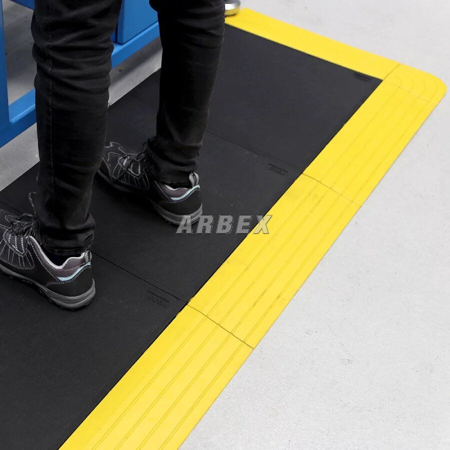 Náběhová hrana pro bezpečný přístup na protiúnavové rohože. protiskluzový povrch zvyšuje bezpečnost práce a minimalizuje riziko uklouznutí. odolná guma je vhodná pro použití v interiéru i exteriéru a chrání rohož i podlahu před poškozením.