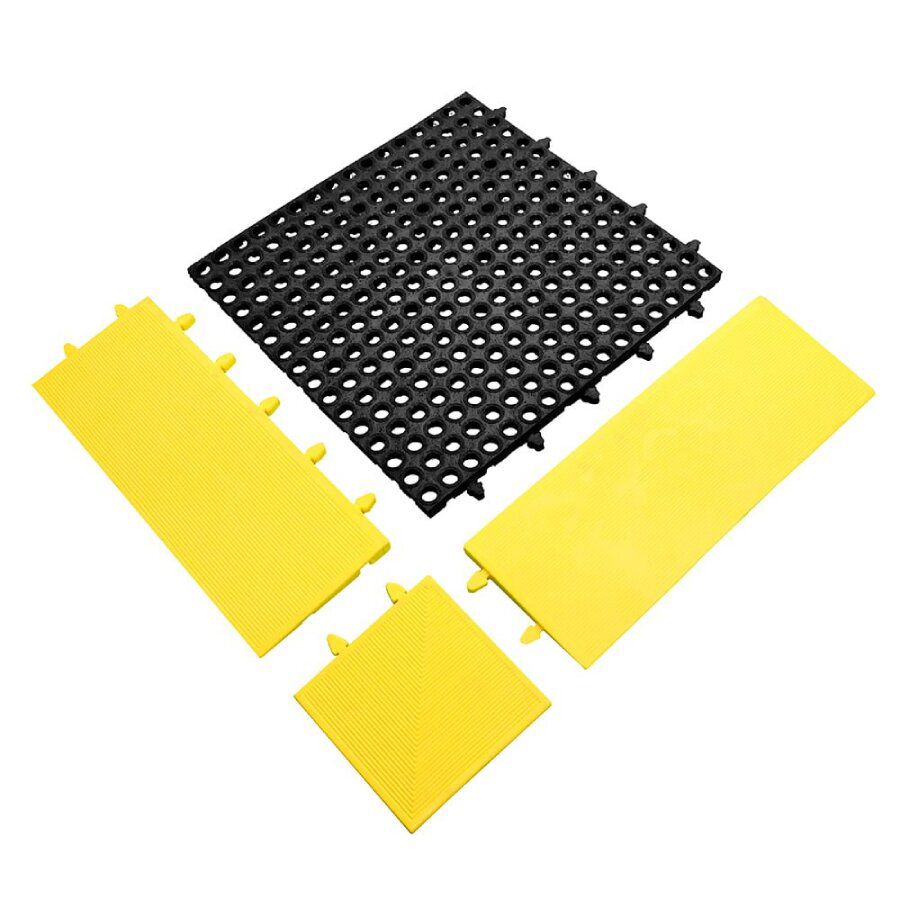 Náběhová gumová hrana pro bezpečný přístup na protiúnavové rohože. protiskluzový povrch zvyšuje bezpečnost práce a minimalizuje riziko uklouznutí. odolná guma je vhodná pro použití v interiéru i exteriéru a chrání rohož i podlahu před poškozením.