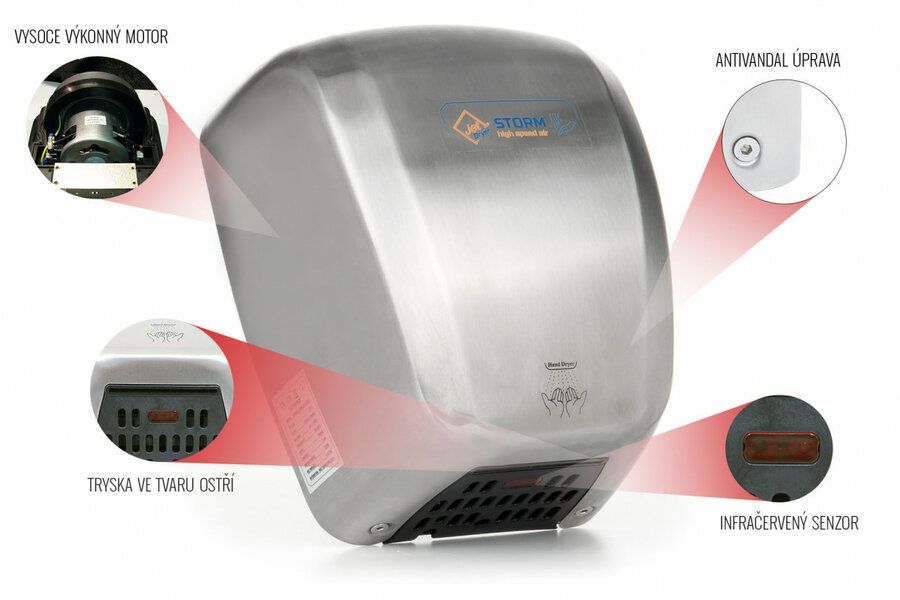 STORM představuje kombinaci kompaktních rozměrů horkovzdušných osoušečů se sušící silou tryskových vysoušečů. Robustní kovová konstrukce je vhodná i do vysoce frekventovaných míst.