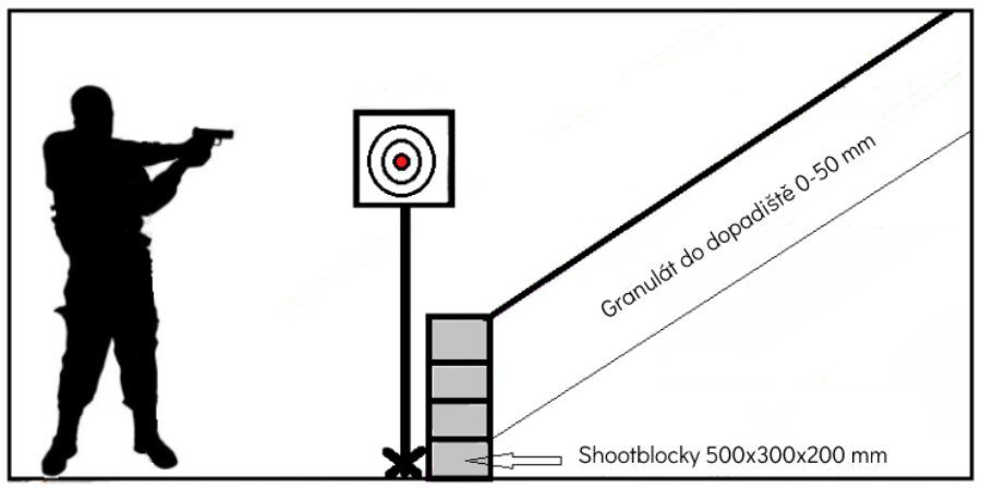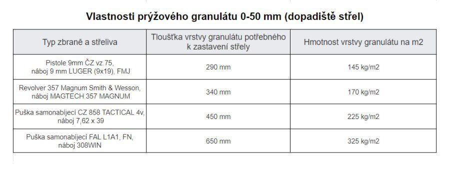 Gumový granulát do dopadiště střel má výborné zastavující a protihlukové účinky. Nejčastější využití nalezne jako výplň do dopadiště střel u terčů. Díky velikosti 0-50 mm se malé ráže od granulátu neodrážejí zpět ke střelci a další výhodou je zde jednoduché a rychlé prosívání granulátu a střel. Gumový granulát je možné kombinovat s Shootblocky, aby se zmenšila hloubka dopadiště.
