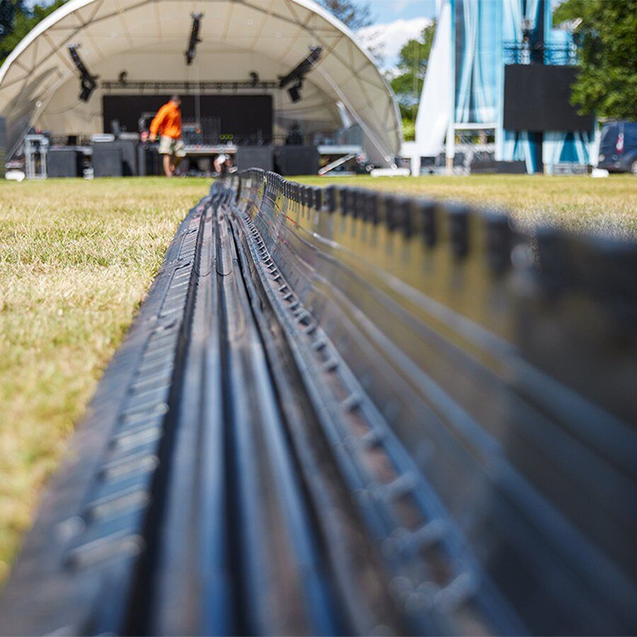 Kabelový most DEFENDER MINI disponuje černým víkem a třemi kanály pro ochranu kabelů, hadic či trubek na chodnících, ve výrobních provozech, na výstavách, kulturních akcích, v kancelářích apod.