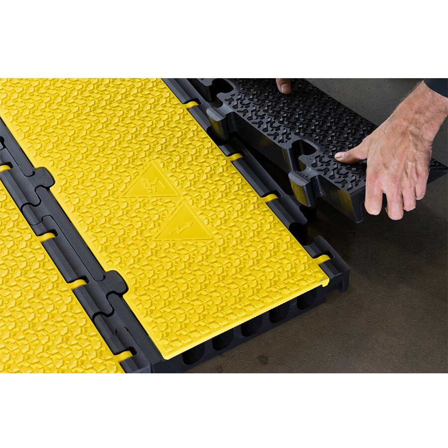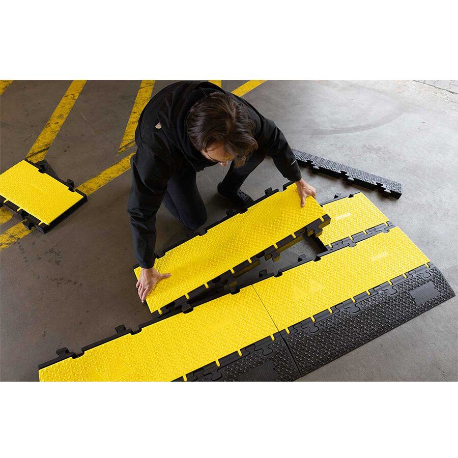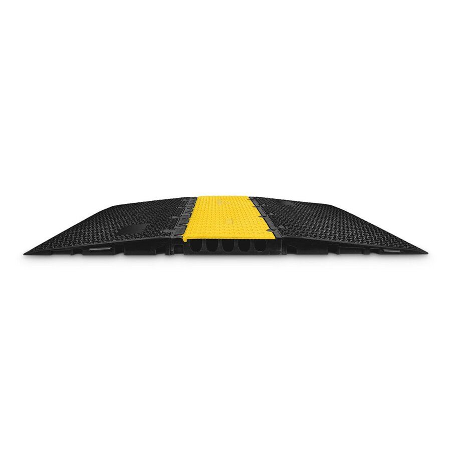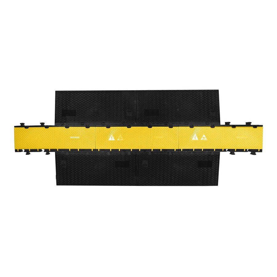 Kabelový most DEFENDER MIDI 2D disponuje žlutým víkem a pěti kanály pro ochranu kabelů, hadic či trubek na chodnících, ve výrobních provozech, na výstavách, kulturních akcích, v kancelářích apod.