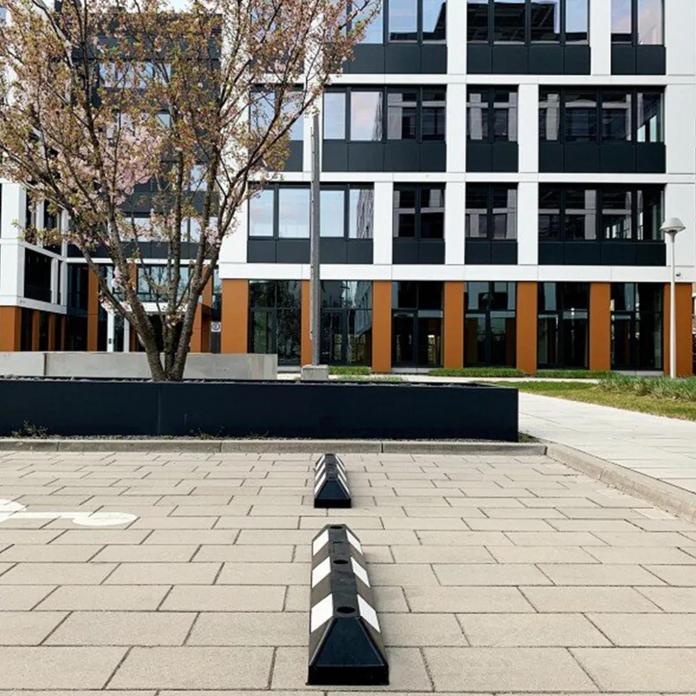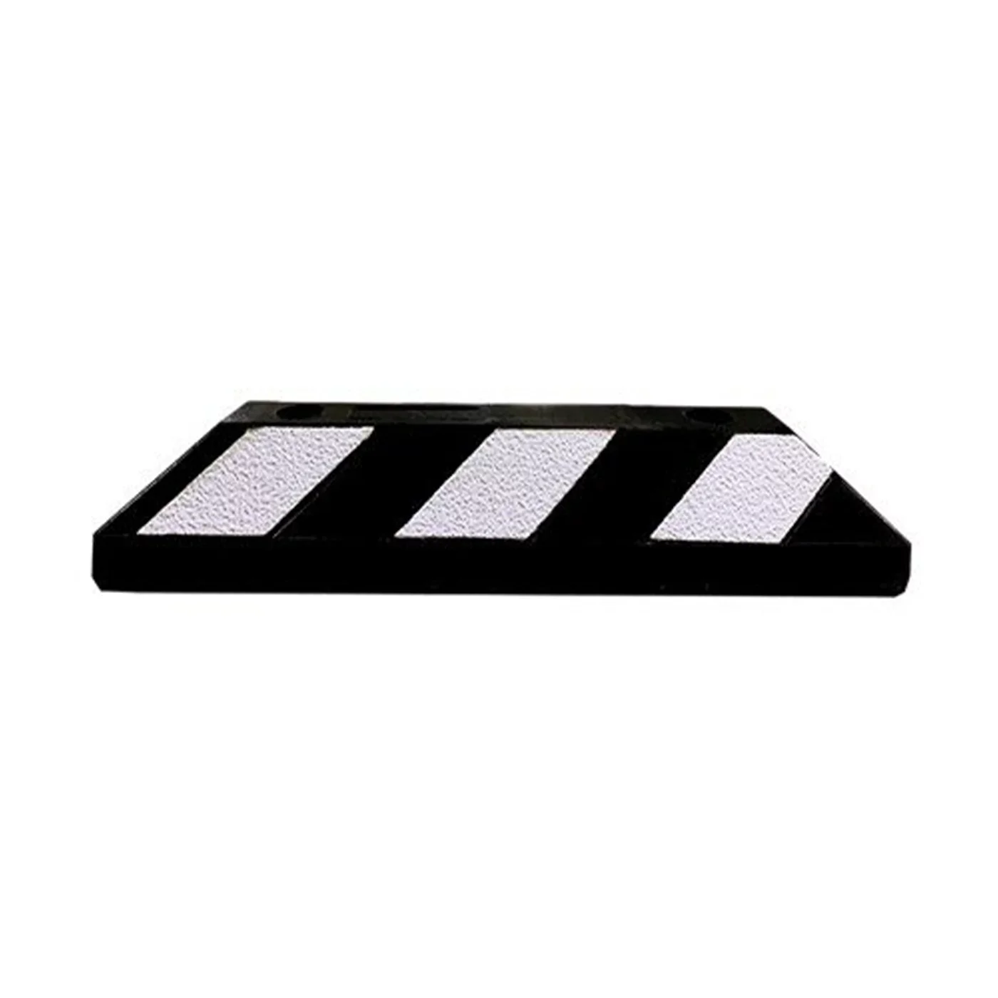 Černo-bílý gumový reflexní parkovací doraz jsou vyrobeny z extrémně odolné, jednotné a trvdé pryžové směsi. Při vystavení nepříznivým povětrnostním podmínkám se material nedelaminuje ani nebarví. Tyto dorazy označují hranici parkovacího místa. Jsou opatřeny diagonálními pruhy reflexní pásky.
