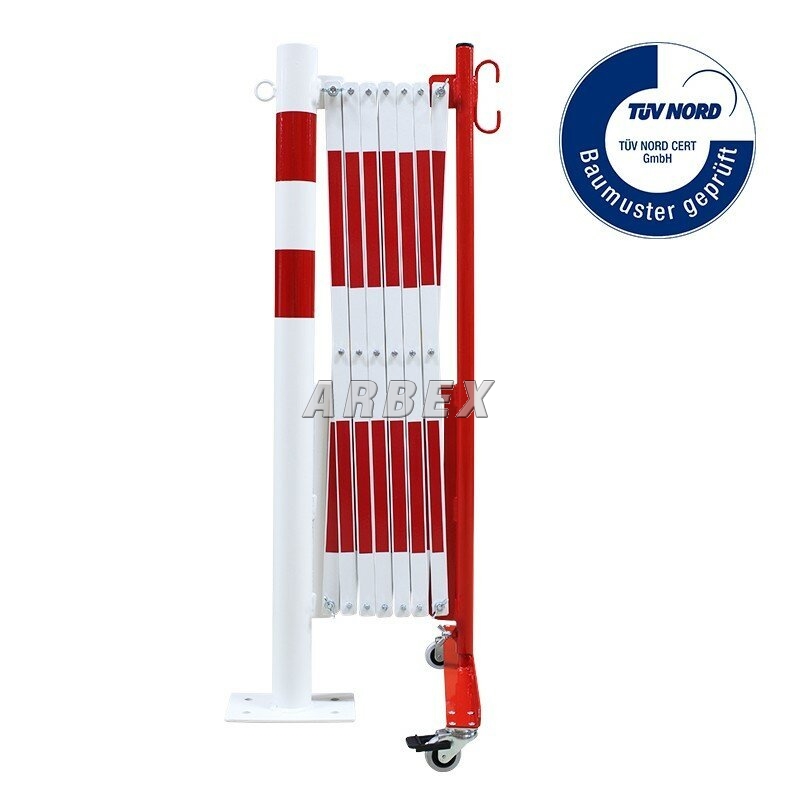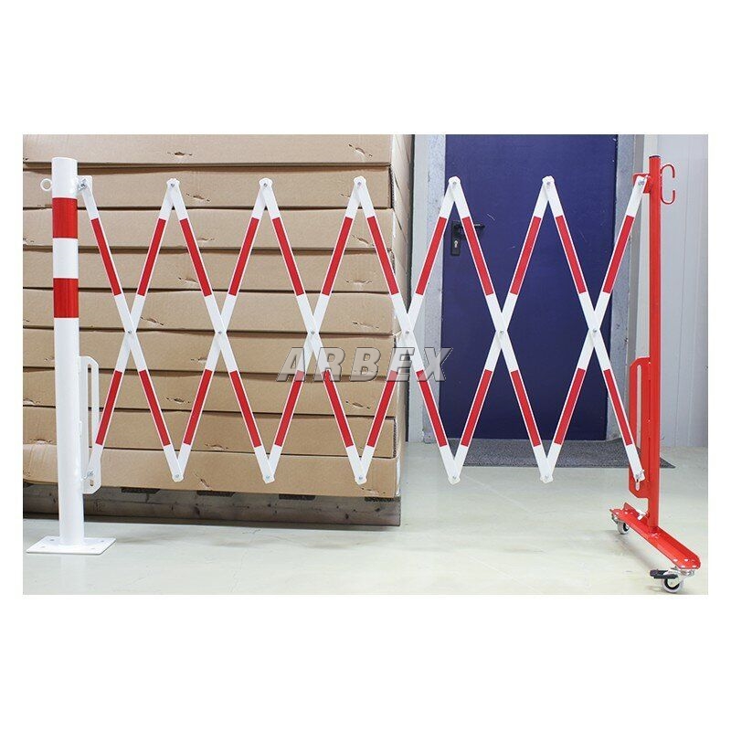 Bílo-červená bariéra se sloupkem. Vyrobena z vysoce kvalitní oceli. Skládací zábrana je vybavena pojízdným sloupkem s kolečky. V nabídce jsou bíle a červeně lakované ocelové zábrany (označené z obou stran reflexní fólií) nebo žluté a černé.