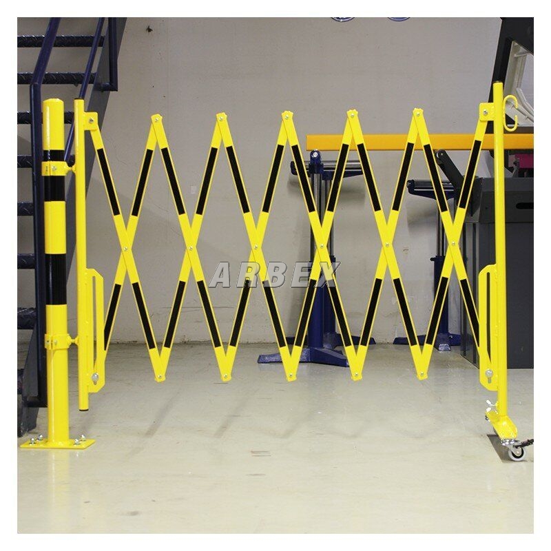 Černo-žlutá bariéra se sloupkem. Vyrobena z vysoce kvalitní oceli. Skládací zábrana je vybavena pojízdným sloupkem s kolečky. V nabídce jsou bíle a červeně lakované ocelové zábrany (označené z obou stran reflexní fólií) nebo žluté a černé.