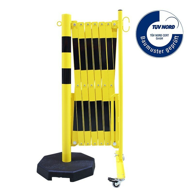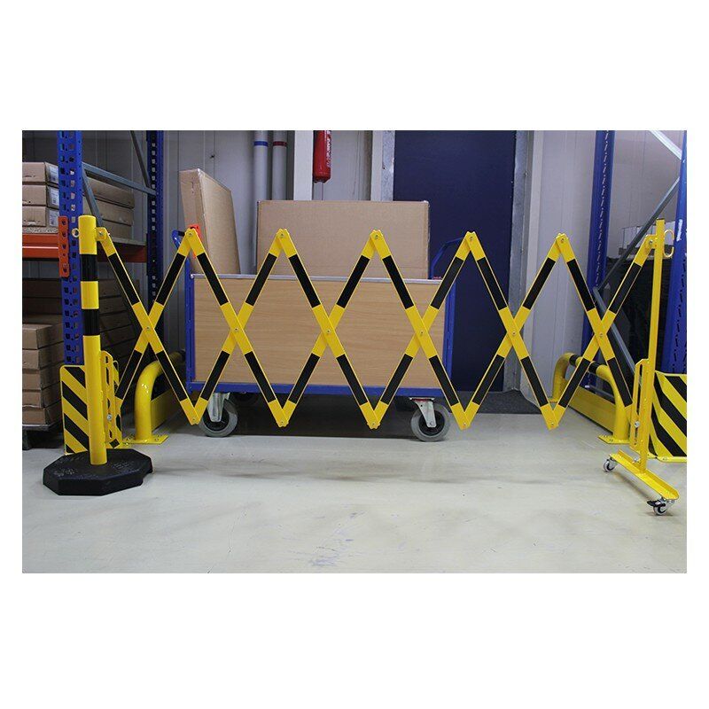 Černo-žlutá sloupková přenosná mobilní bariéra je vyrobena z vysoce kvalitní oceli. Skládací zábrana je vybavena pojízdným sloupkem s kolečky. V nabídce jsou bíle a červeně lakované ocelové zábrany (označené z obou stran reflexní fólií) nebo žluté a černé.