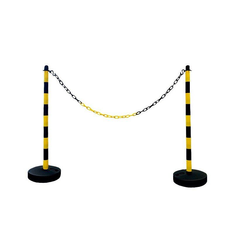 Černo-žlutý plastový vymezovací sloupek s podstavou na výplň. Aby byla zachována odolnost a stabilita systému oplocení, měly by být jejich základy doplněny vodou nebo pískem. Snadno se přenášejí a přepravují. V nabídce jsou bílo-červené nebo žluto-černé. Plastový řetízek se na čepici připevňuje odříznutím posledního článku (zářez umožňuje provlečení segmentu řetízku uzavřeným okem čepice) nebo dodatečně pomocí spojky S . Sloupy mají stabilní kulaté pryžové základny. Řetěz lze zkrátit na libovolnou délku. Toto balení obsahuje pouze jeden sloupek.