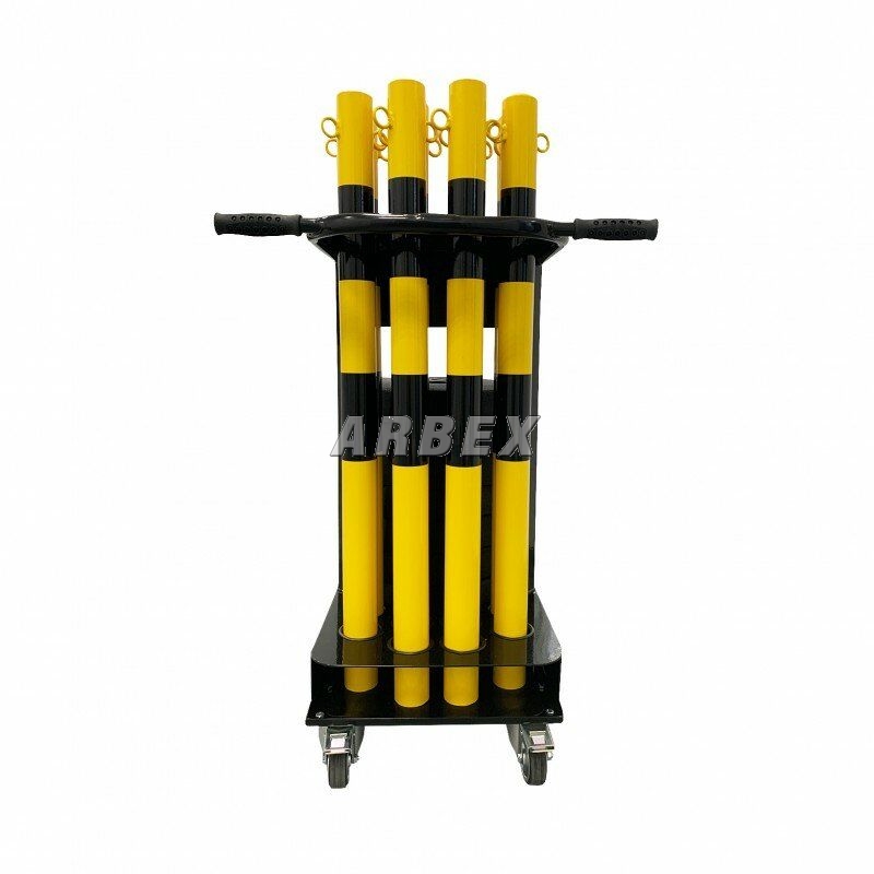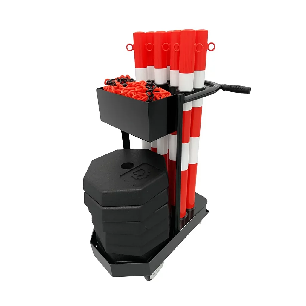 Bílo-červený ocelový gumový sloupek se zatíženou pryžovou podložkou. V nabídce jsou sady skládající se z pojízdného vozíku, plastového řetězu a 6 nebo 8 ocelových sloupků. Ocelové sloupky s pryžovou základnou umožňují snadno a rychle oplotit dočasné zóny venku i uvnitř průmyslových objektů. Pojízdný vozík umožňuje přepravu sloupků, usnadňuje také skladování jednotlivých prvků sestavy. Zadní část vozíku je místem pro uložení ocelových sloupků, přední kapsa slouží pro uložení plastového řetězu (ohradník), spodní police - přizpůsobený prostor pro gumové základny.