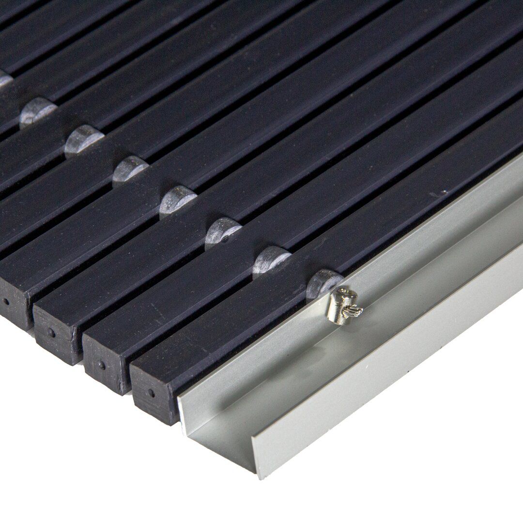 Na přední straně rohože je připevněna nájezdová hliníková lišta zabraňující zakopnutí a případný pohodlný přejezd vozíků nebo kočárků. Vstupní rohož je možné omývat vysokotlakou vodou a v případě potřeby srolovat.