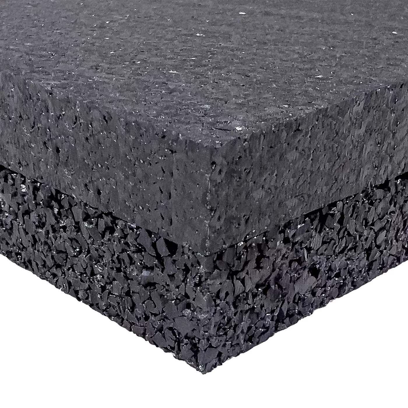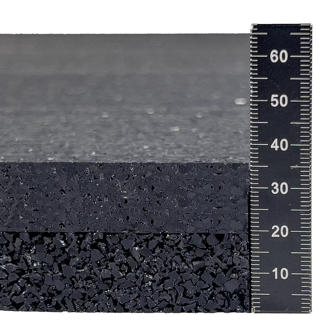 Podlahová guma (deska) SF1050 s antivibrační elastomerickou deskou S650. Kombinace fitness desky a antivibrační desky využijete především v místech, kde potřebujete odolný povrch a zároveň odtlumení vibrací. Obě desky naleznete v naší nabídce samostatně, nicméně tímto vhodným spojením získáte vlastnosti obou desek v jednom balení.