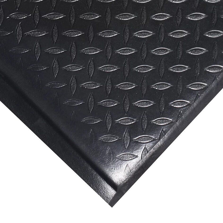PVC protiúnavová rohož FLOMA Plus s diamantovým vzorem, který zajištuje prevenci uklouznutí. Rohož svou výškou a zvoleným materiálem příznivě snižuje účinky dlouhodobého stání pracovníků na stejném místě, uvolněním tlaku na chodidla, nohy i záda a podporuje tak proudění krve v těle.
