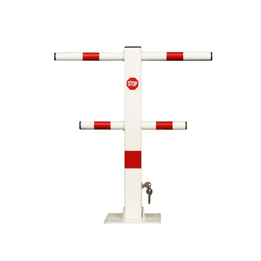 Bílo-červený parkovací sloupek s reflexními pruhy, vyrobený z vysoce kvalitní oceli. Je ozvláštněna čtvercovým, svyslým sloupkem a dvěma vodorovnými příčníky (horizontálními rameny). Tato blokáda je přáškově lakovaná, její bílý povrch konstrastuje s červenými odlesky. Ramena a čtyřhranný sloupek byly uzavřeny plastovou krytkou proti hromadění vody uvnitř (ochrana proti korozi). Svislý sloupek byl navíc označen grafickou značkou symbolizující zákaz vjezdu nebo značkou s nápisem STOP. Sloupek se dá zamykat zámkem.
