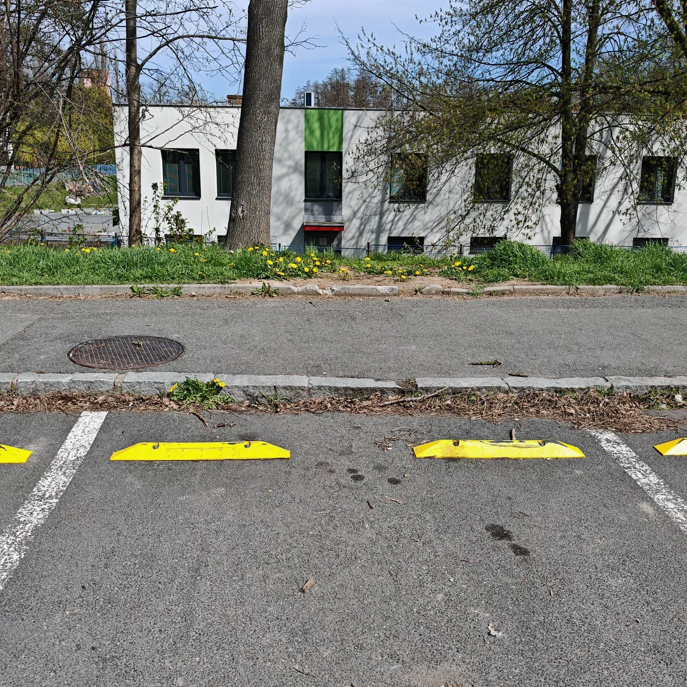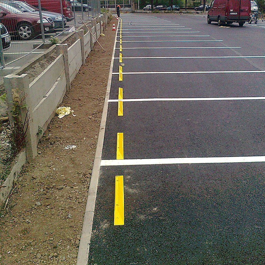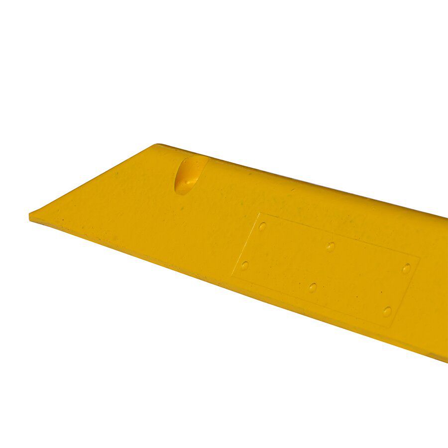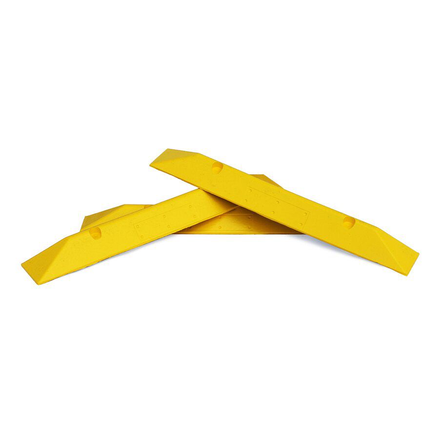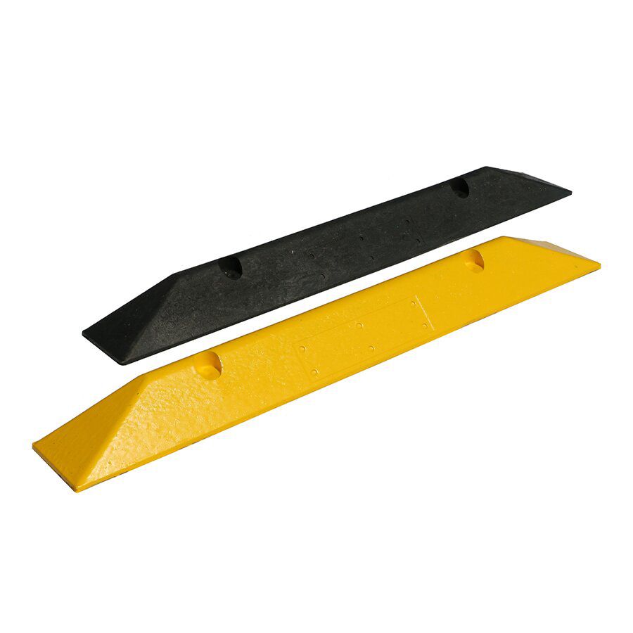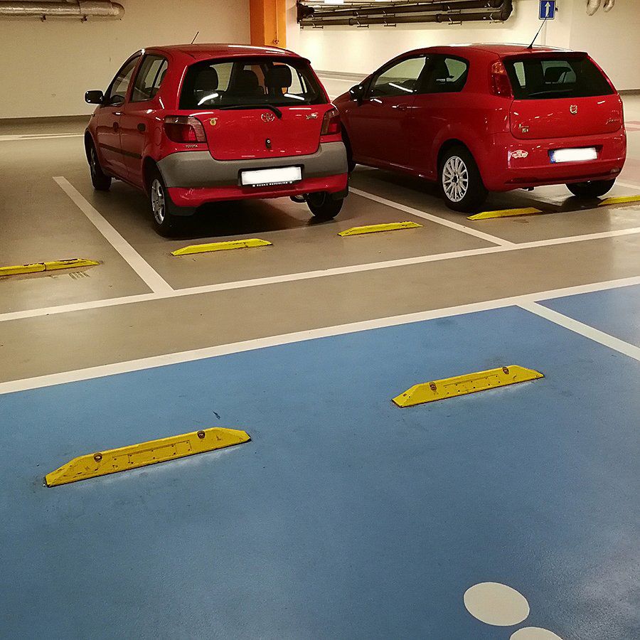Doraz je vyroben z vysoce odolného tvrzeného plastu, který vyniká vynikající chemickou stálostí vůči olejům, pohonným hmotám i posypovým solím. Materiál je nesnadno hořlavý a plně odolný vůči UV záření, což zaručuje jeho dlouhou životnost bez ztráty mechanických vlastností. Nízká hmotnost 2,5 kg usnadňuje manipulaci, zatímco robustní profil o výšce 6 cm bezpečně zastaví osobní i menší užitkové vozy, aniž by hrozilo poškození moderních nízkých podvozků.