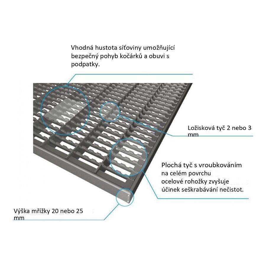 Tato ocelová vstupní rohož je vhodná jako první čistící zóna k očištění obuvi od hrubých nečistot, především bahna, kamínků a sněhu. Rohož dopuručujeme doplnit druhou, vnitřní textilní rohoží, která odstraní jemné nečistoty, vlhkost a prach. Rohož lze použít i jako odvodňovací rošt, kdy se rošt zapustí pod úroveň podlahy na připravený odtokový žlab.