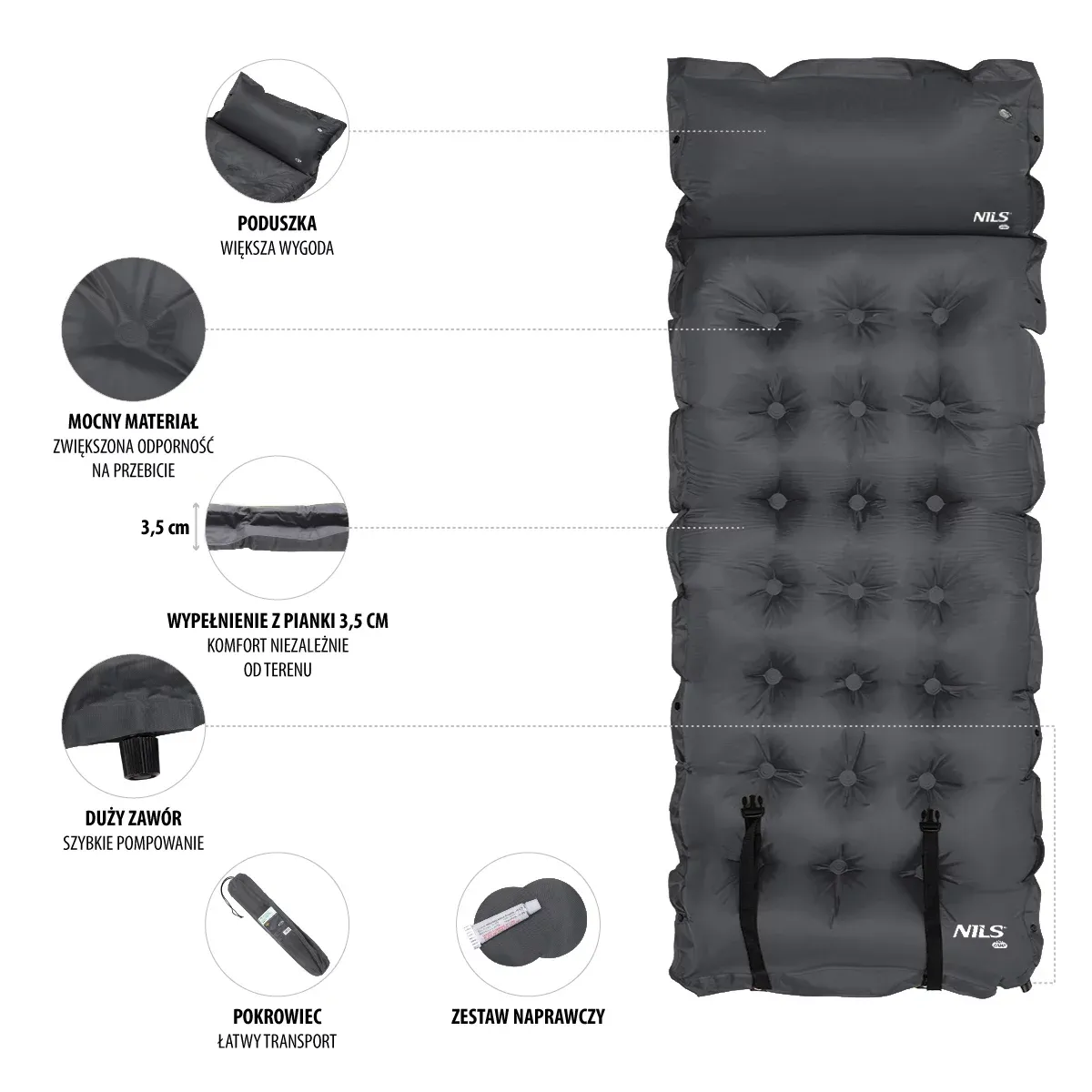 Samonafukovací karimatka NILS CAMP NC4018 zajistí kvalitní spánek během kempování a dovolených pod stanem. Podložka je ale vhodná i k vodě a všude tam, kde si chcete příjemně poležet.