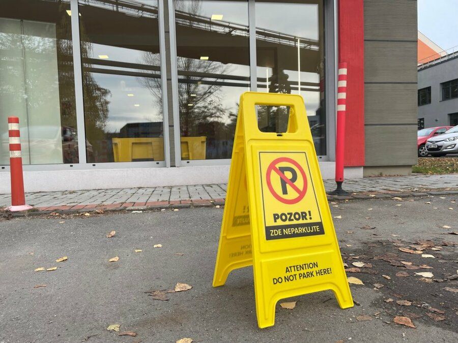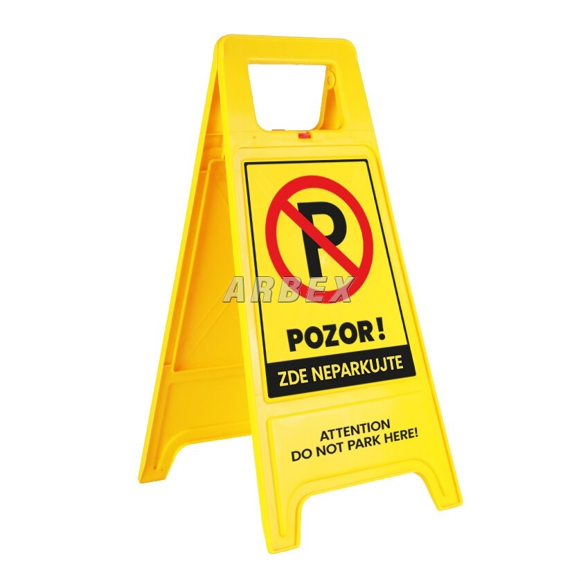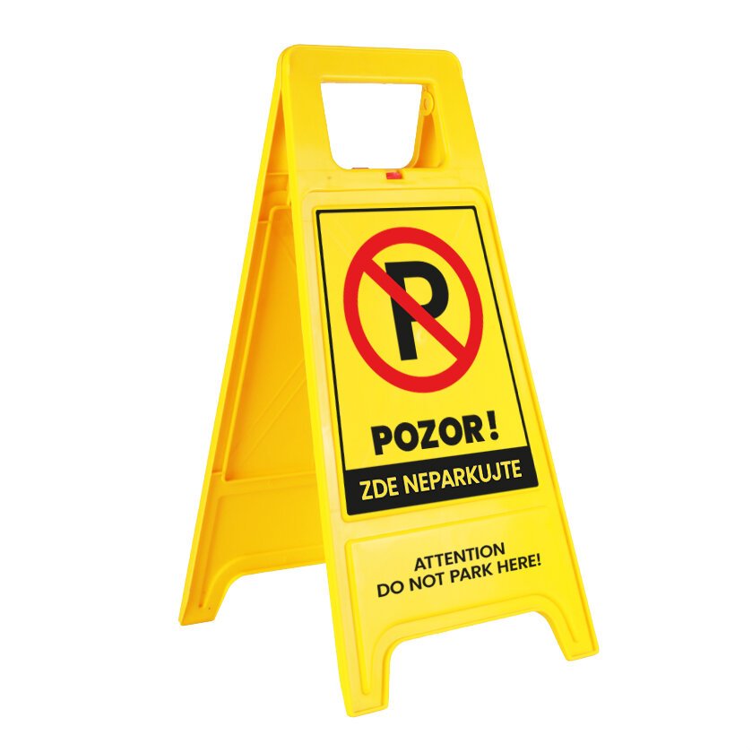 Žlutý plastový výstražný stojan „Pozor! Zde neparkujte“ je určen k dočasnému označení parkovacích omezení ve veřejných i firemních prostorách. Dvojjazyčné provedení (česko-anglický text) zajišťuje srozumitelnost i pro zahraniční návštěvníky. Výstražný text spolu s výraznou žlutou barvou a piktogramem upozorňuje řidiče na dočasný zákaz parkování z důvodu úklidu, zásobování, stavebních nebo servisních prací.